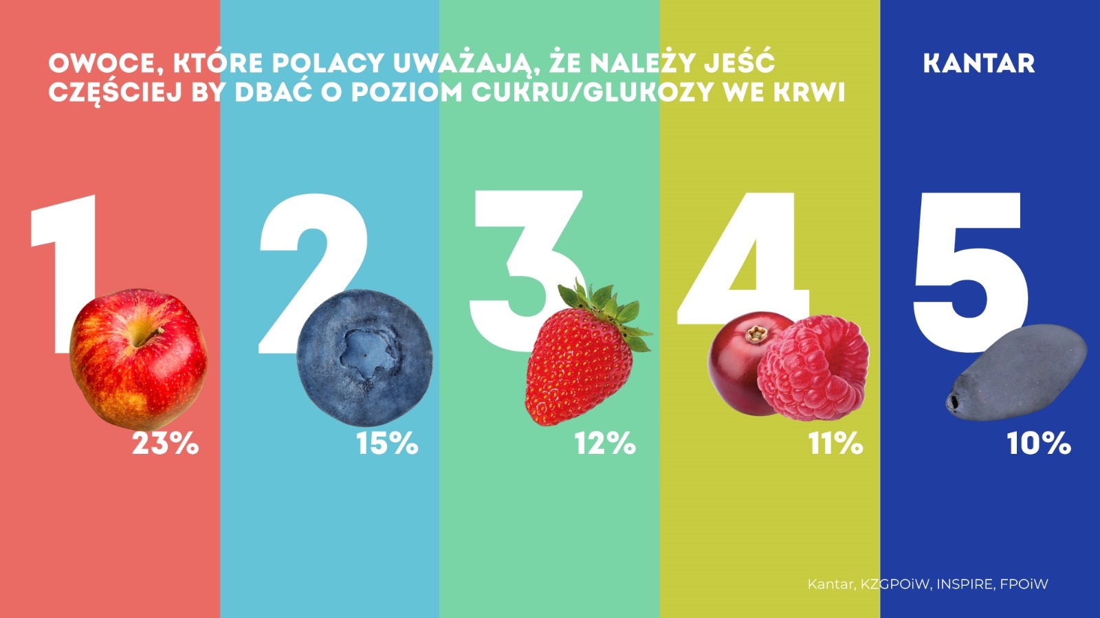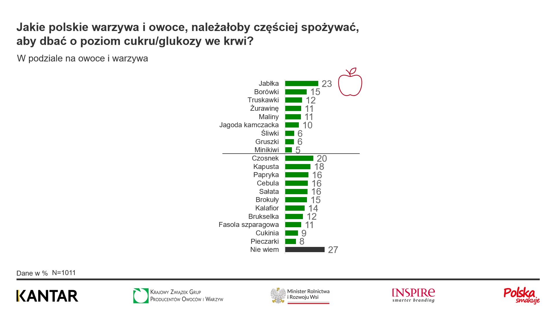 Najczęściej wymienianym gatunkiem, który należałoby spożywać częściej, aby dbać o poziom cukru we krwi, okazało się jabłko z wynikiem 23%.
