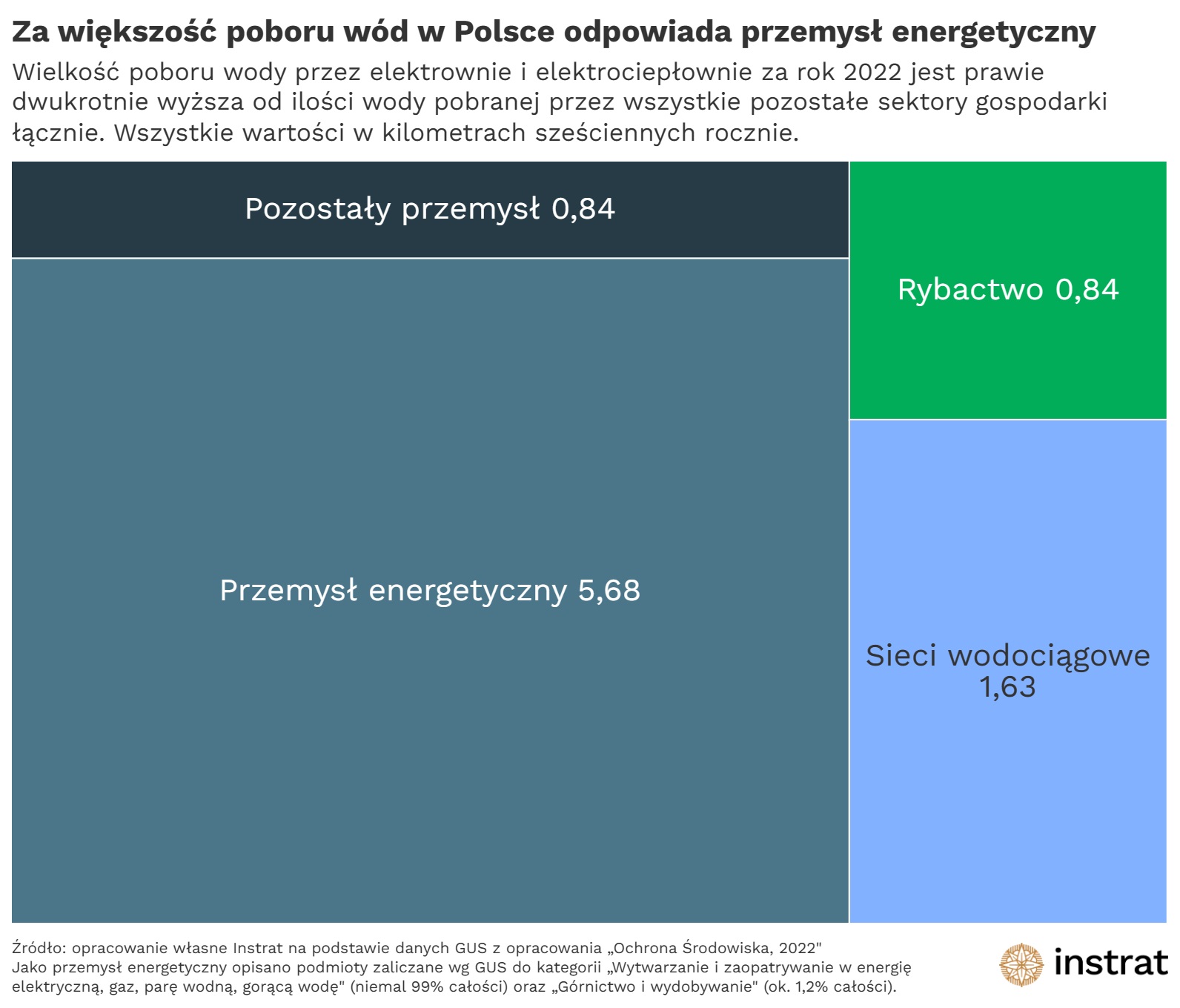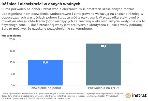 Dane pozyskane przez Instrat dotyczące poboru wody przez kopalnie i elektrownie nie przedstawiają całego obrazu. W przypadku kilku elektrowni z otwartymi obiegami chłodzenia dopuszczalny pobór wody może być o kilka rzędów wielkości większy lub mniejszy niż dozwolone emisje ścieków. Przykładowo, dla Elektrowni Dolna Odra różnica ta wynosi niemal 5 km3 rocznie. Dla Elektrowni Połaniec i Elektrowni Kozienice różnica wynosi odpowiednio 2 km3 i 11 km3 rocznie.