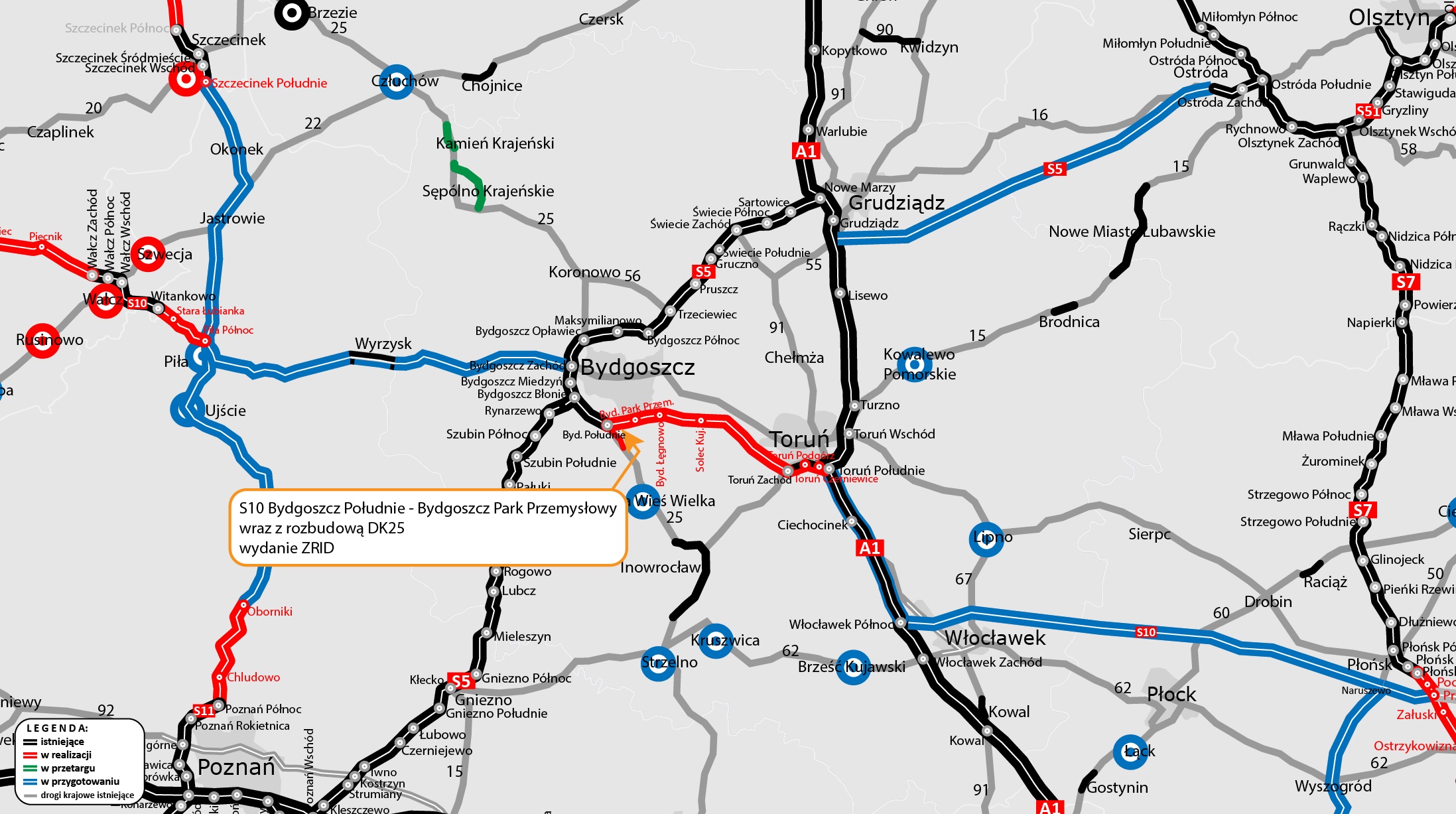 Budowa drogi ekspresowej S10 jest realizowana w ramach Rządowego Programu Budowy Dróg Krajowych do roku 2030 (z perspektywą do 2033 r.). Pozostałe trzy odcinki S10 Bydgoszcz - Toruń w dalszym ciągu są na etapie procedury uzyskiwania decyzji ZRID. Więcej w komunikacie i na stronach kontraktów.