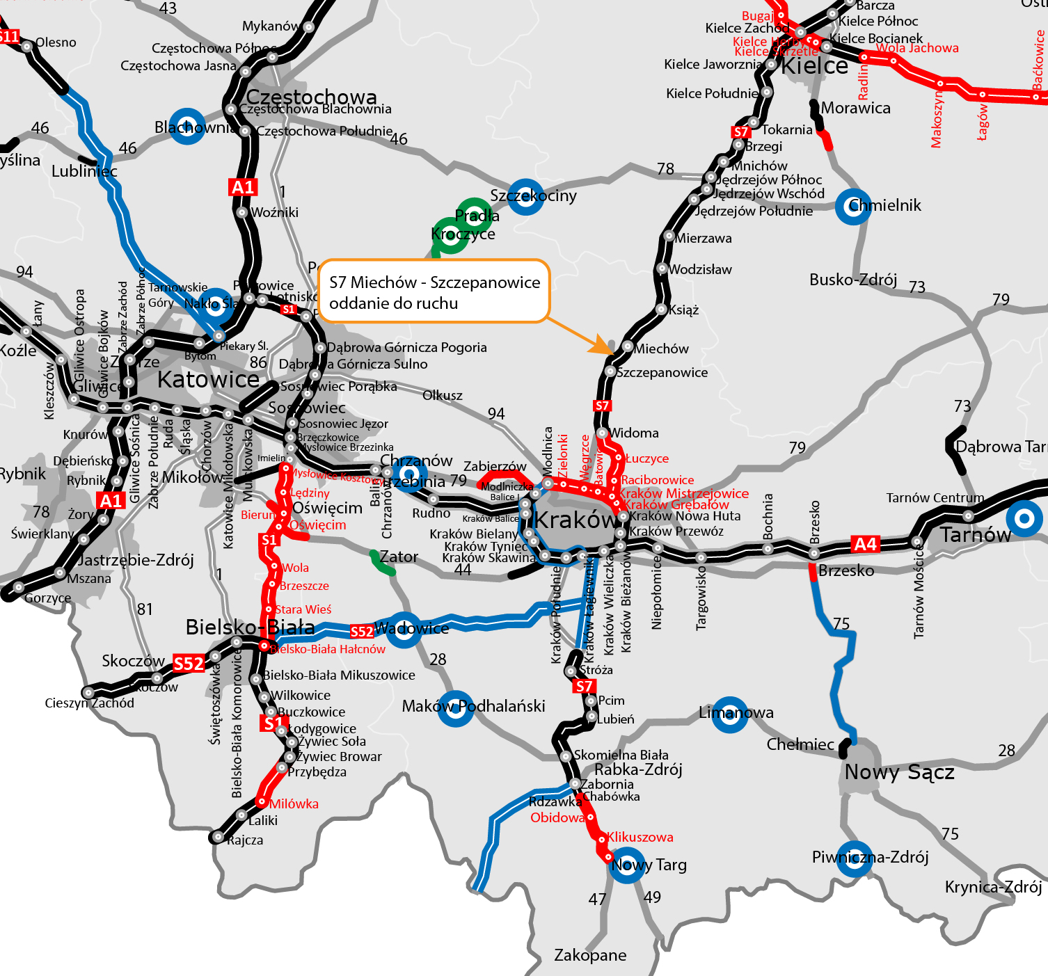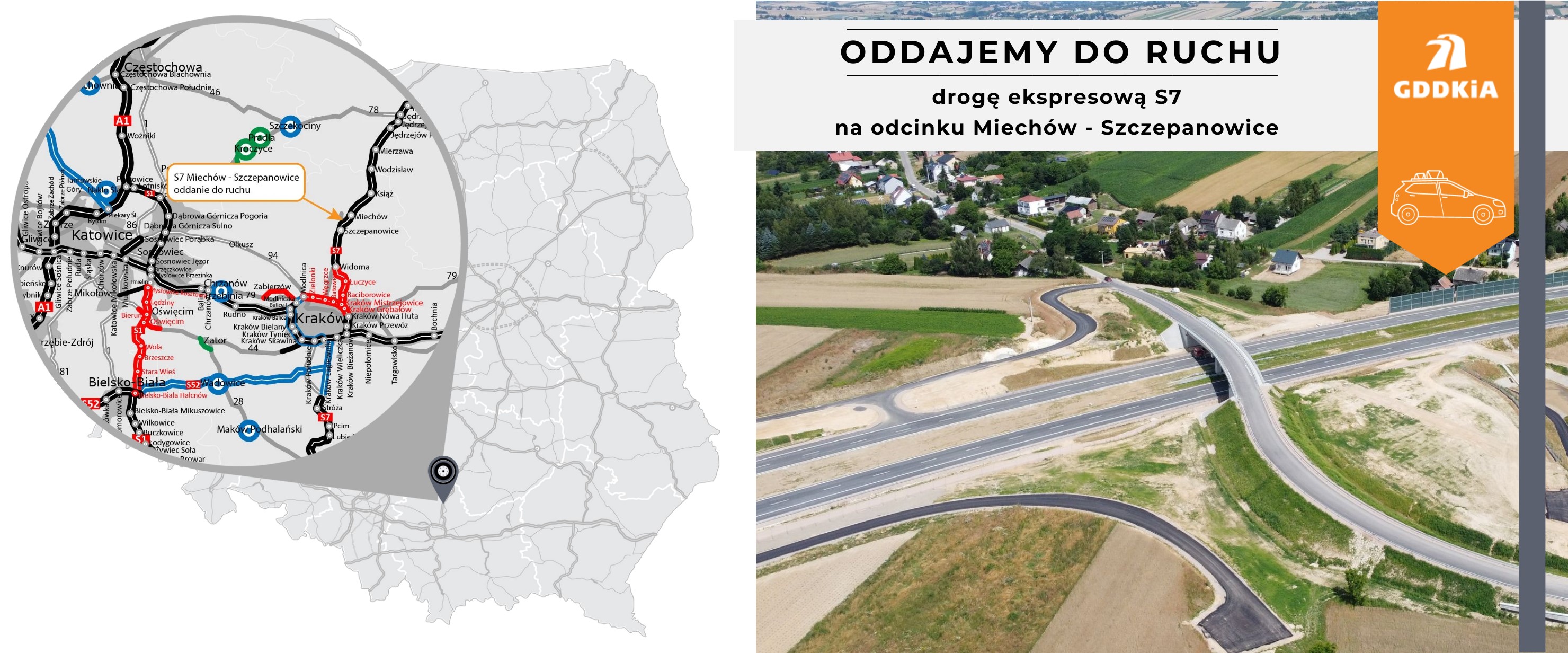 GDDKiA otworzyła ponad 5-kilometrowy odcinek S7 między Miechowem a Szczepanowicami. Połączył on już funkcjonujące Moczydło - Miechów i Szczepanowice - Widoma, dzięki czemu na północ od Krakowa, dokładnie od Widomej, kierowcy mają do dyspozycji blisko 260 km nieprzerwanej drogi ekspresowej do Warszawy.