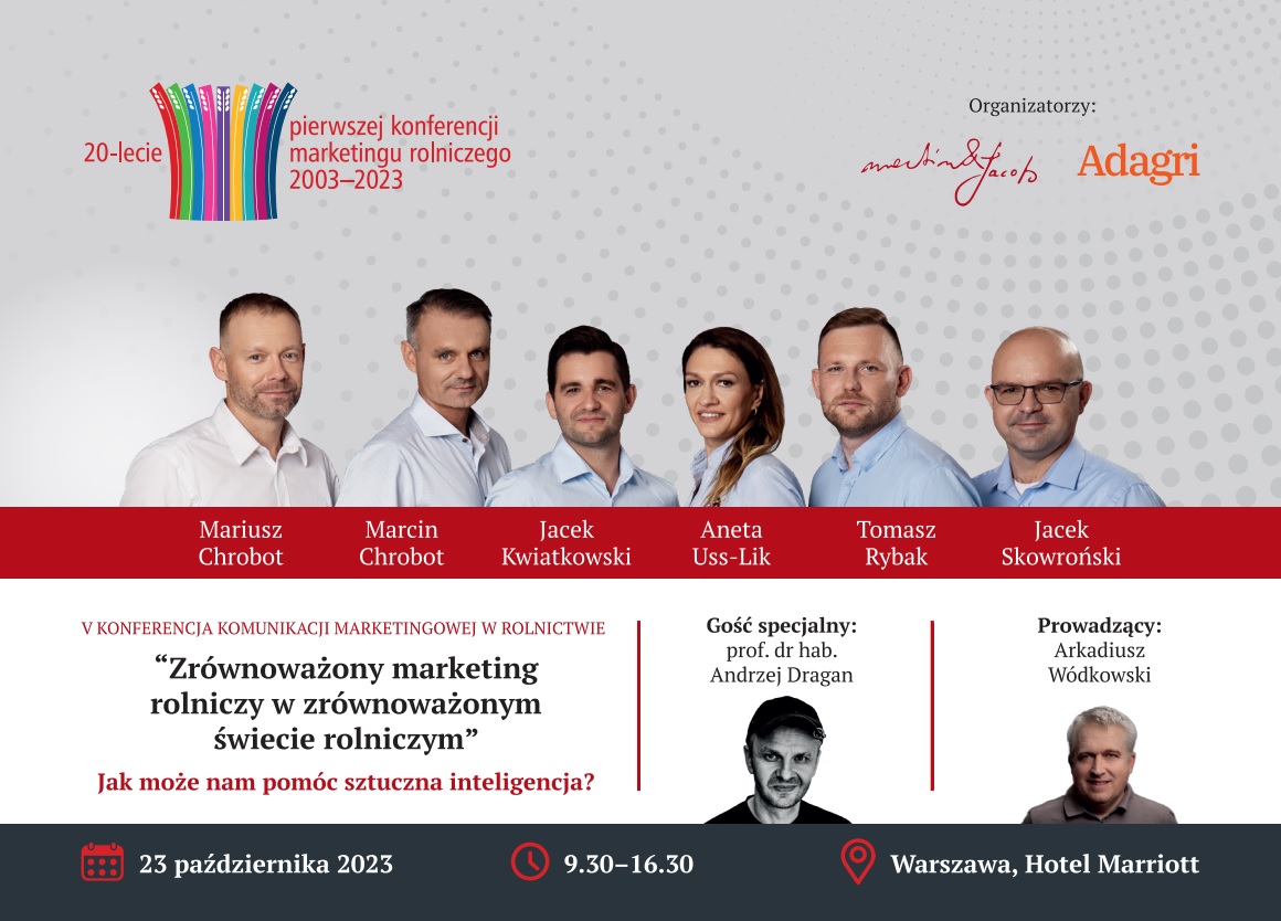 W dniu 23 października 2023 r. w Hotelu Marriott przy Alejach Jerozolimskich 65/79 w Warszawie odbędzie się V Konferencja Komunikacji Marketingowej w Rolnictwie. Udział w wydarzeniu, którego celem jest wymiana doświadczeń służąca rozwojowi marketingu w branży agro, potwierdziło blisko 150 osób. Program jubileuszowej konferencji marketingowej dla branży rolnej to 7 wystąpień ułożonych w trzy sesje, których wspólnym mianownikiem jest czynnik sztucznej inteligencji wspierający rozwój marketingu w branży rolniczej.