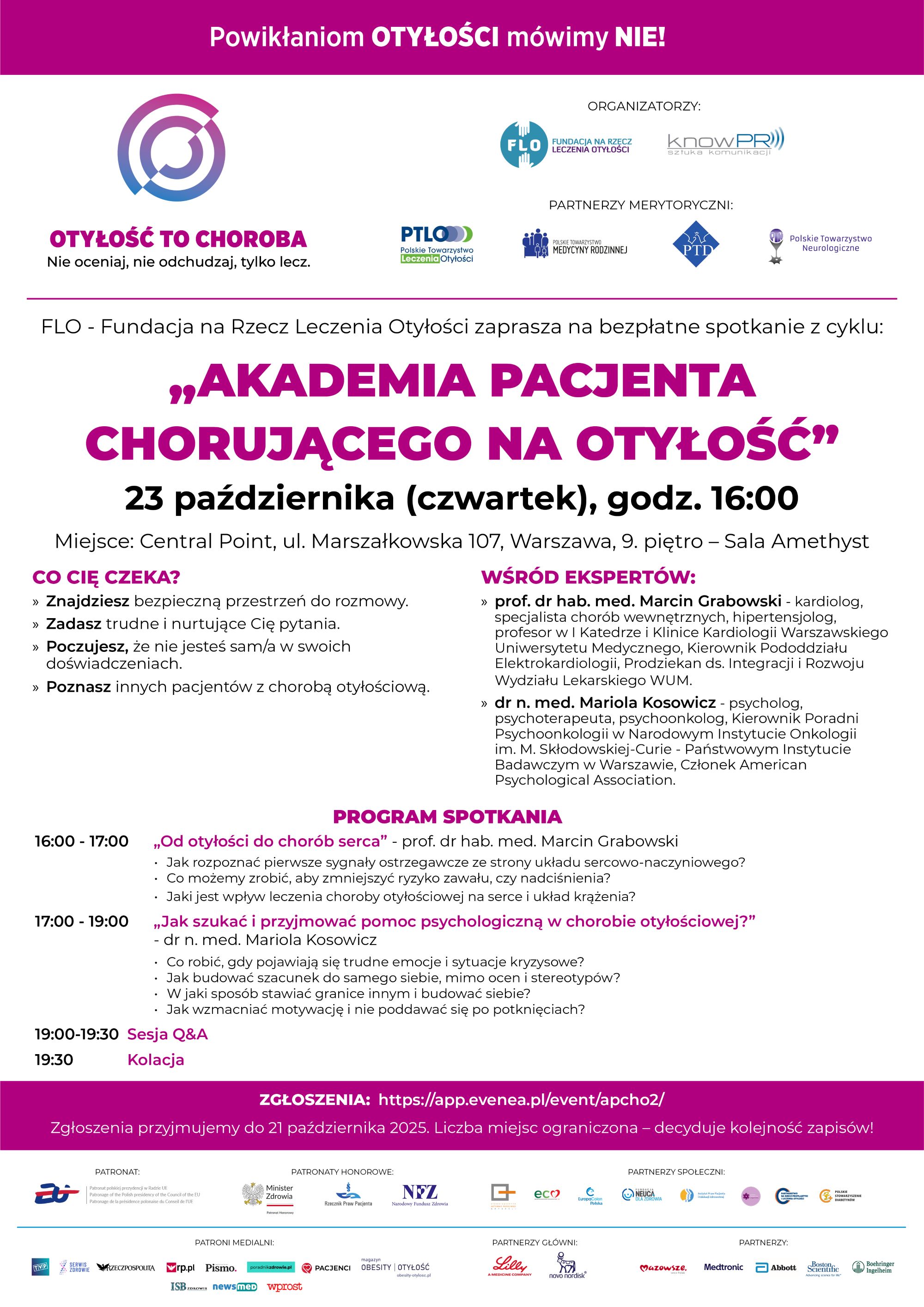 „Statystyki są jednoznaczne. Choroba otyłościowa istotnie zwiększa ryzyko zawałów serca, udarów mózgu i przedwczesnych zgonów. Każdy dzień zwłoki w diagnozie i leczeniu oznacza większe zagrożenie dla zdrowia i życia pacjentów. Dlatego tak ważna jest rola kardiologów, którzy widząc konsekwencje choroby otyłościowej, mogą postawić właściwą diagnozę, a następnie skierować pacjenta do specjalisty zajmującego się leczeniem otyłości” - podkreśla Ewa Godlewska, prezes FLO - Fundacji na rzecz Leczenia Otyłości.