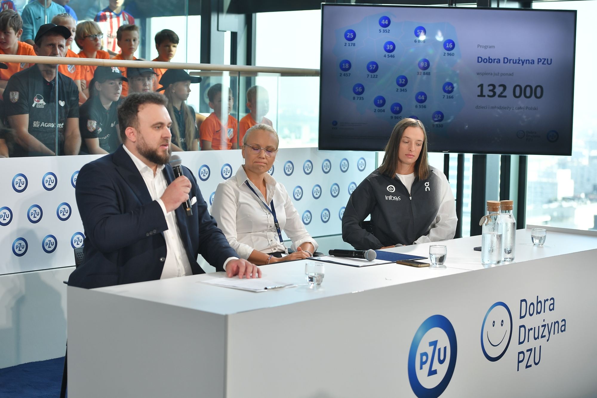 Podczas spotkania w siedzibie PZU na specjalnie przygotowanej trybunie zasiedli młodzi sportowcy oraz ich trenerzy z 15 klubów sportowych, które dzięki wsparciu swych społeczności lokalnych zostały nowymi beneficjentami programu największego polskiego ubezpieczyciela - Dobra Drużyna PZU. Jego celem jest aktywizacja sportowa dzieci i młodzieży z całego kraju, walka z epidemią nadwagi oraz otyłości wśród najmłodszych, a także pomoc w budowaniu relacji towarzyskich z świecie rzeczywistym, a nie wirtualnym.
