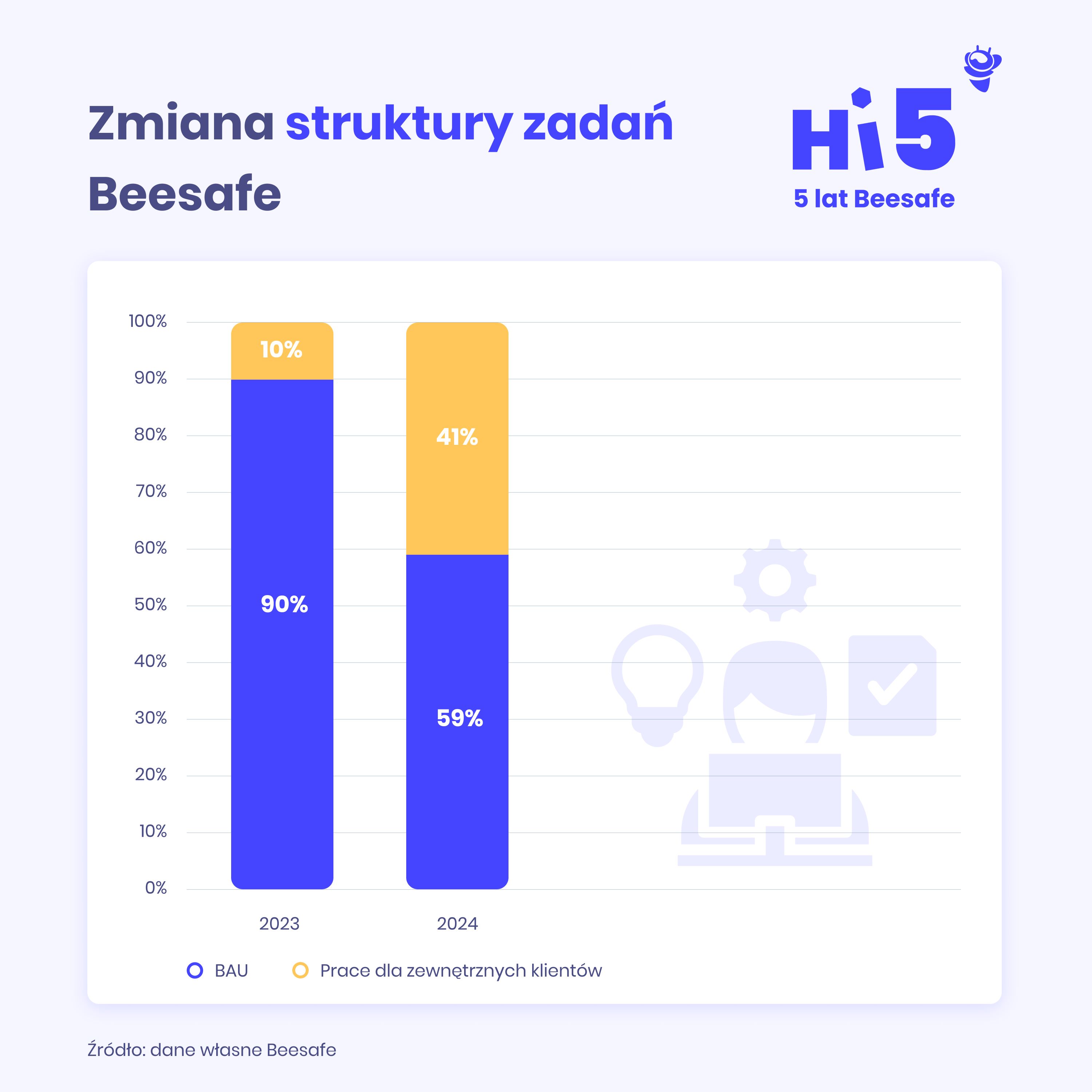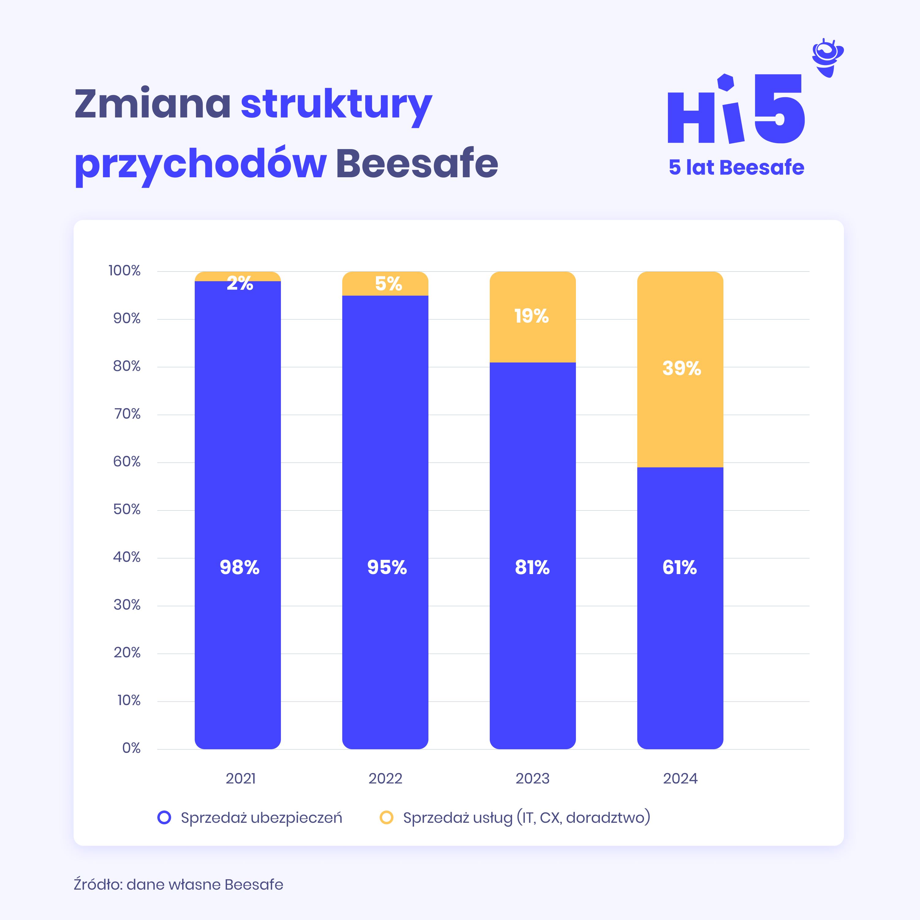 W ostatnich latach znaczące zmiany zaszły również w strukturze przychodów tej spółki. W 2021 r. aż 98% przychodów pochodziło z ubezpieczeń, natomiast usługi IT i doradcze stanowiły tylko 2%. Dzięki systematycznej dywersyfikacji, w 2024 r. proporcje te wyniosły odpowiednio 60% oraz 40%, co dowodzi rosnącego znaczenia Beesafe jako dostawcy usług innych niż związanych ze sprzedażą ubezpieczeń.