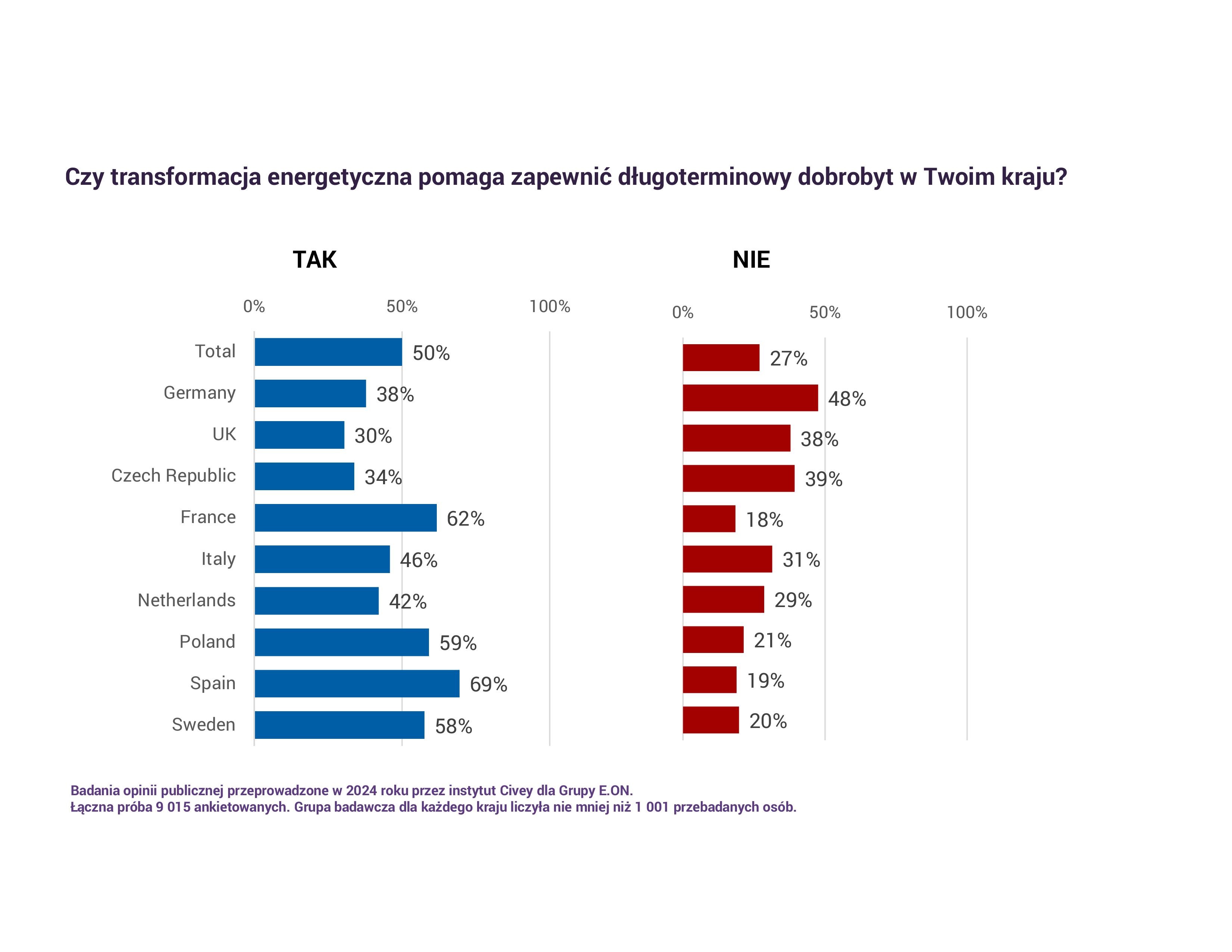 W badaniu klimatycznym wzięli udział obywatele z dziewięciu krajów europejskich. Połowa ankietowanych uważa, że transformacja energetyczna pomoże w długoterminowym zabezpieczeniu dobrobytu w ich własnym kraju. Z tym stwierdzeniem szczególnie zgadzają się respondenci z Hiszpanii (69%) i Francji (62%), a także z Polski (59%) i ze Szwecji (58%). Najwyższe poparcie obserwowane jest wśród osób do 39. roku życia, posiadających wykształcenie wyższe oraz średnie lub wysokie dochody.