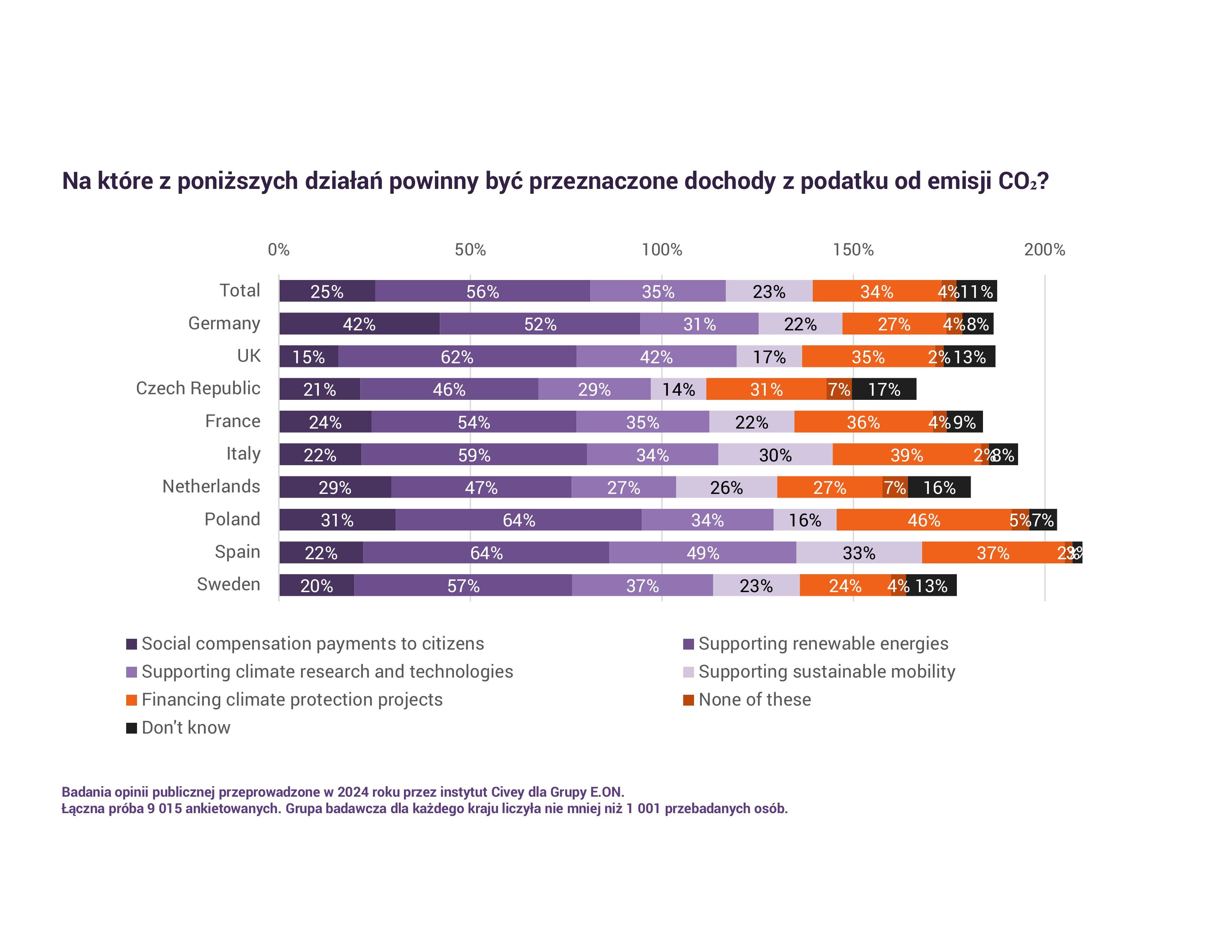 Jednym z rozwiązań, które może wspierać zrównoważoną transformację, jest efektywne zagospodarowanie dochodów z podatku od CO2. Mogą być one wykorzystane na finansowanie działań związanych z ochroną środowiska, wsparcie dla społeczności angażujących się w transformację energetyczną czy inwestycje w zrównoważony rozwój. Większość biorących udział w badaniu – również w Polsce – chciałaby, aby dochody z podatku od CO2 były przeznaczane na promowanie energii odnawialnych (64%), finansowanie projektów ochrony klimatu (46%) oraz badania i nowe technologie dla klimatu (34%).