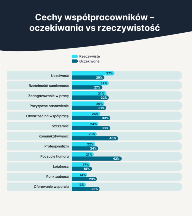 Ankietowani zostali również zapytani o to, jakie są najbardziej pożądane przez nich cechy u kolegów z pracy. Zdecydowana większość - bo niemal 40% - wskazała na uczciwość. Co trzecia osoba przyznała, że najbardziej ceni sobie rzetelność i sumienność oraz zaangażowanie w powierzone obowiązki.