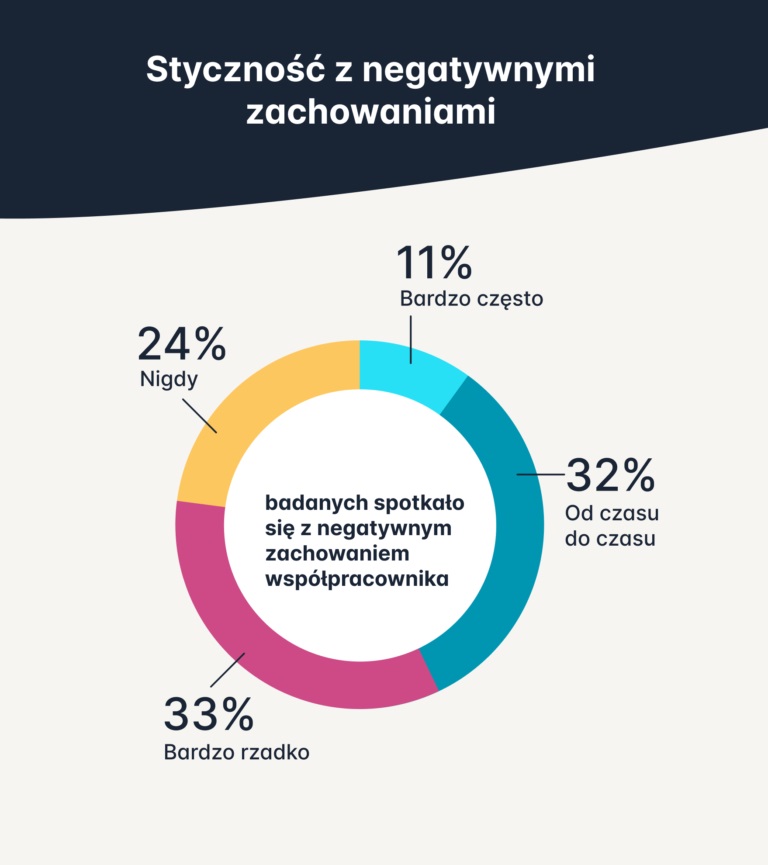 Jak wynika z badania pt. „Polacy w pracy - w kontekście przejawianych zachowań” przeprowadzonego przez ARC Rynek i Opinia, połowa Polaków traktuje pracę głównie jako sposób utrzymania się. Jednocześnie 59% ankietowanych przyznaje, że jest dla nich istotnym elementem życia, a 54% czerpie z niej satysfakcję. Atmosfera w miejscu pracy jest ważna, a negatywne zachowania współpracowników mogą nas mocno do firmy zniechęcić.