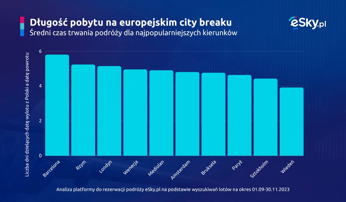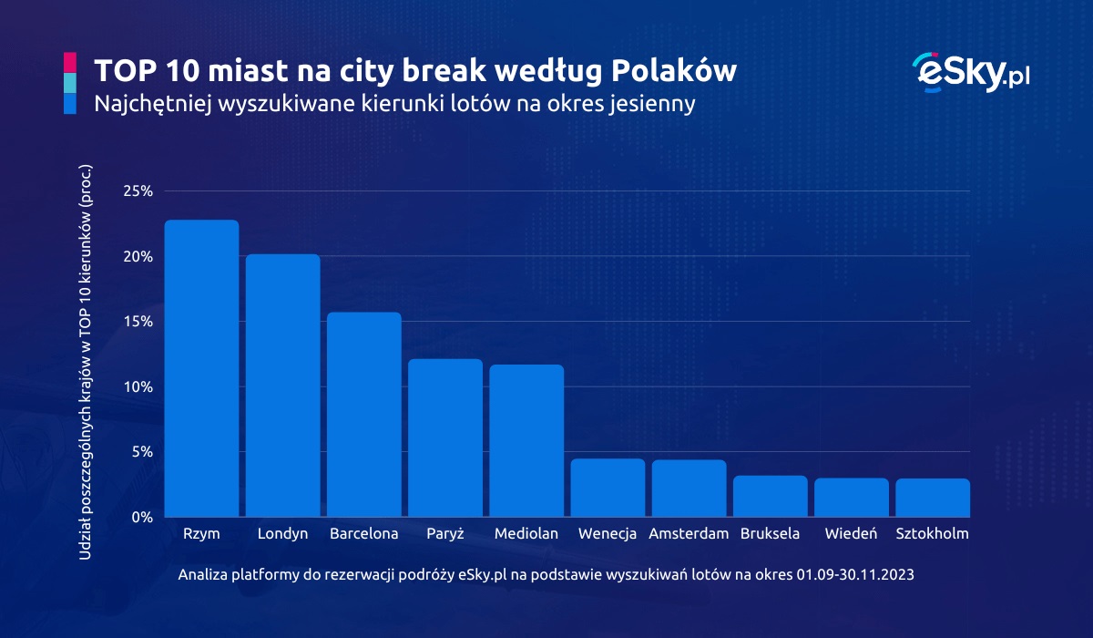 Dane z serwisu eSky.pl wykorzystane w analizie dotyczą wyszukiwań lotów na okres 01.09-30.11.2023, które wykonano od 01.06.2023 do 31.08.2023. Dane są wyłącznie z rynku polskiego i uwzględniają loty w obie strony, dla których wylot odbył się lub odbędzie z lotnisk w Polsce. Łączny udział zapytań dla 10 miast w rankingu najchętniej wyszukiwanych miast na jesienny city break wynosi 30 proc. wszystkich wyszukiwań w serwisie z omawianego okresu.