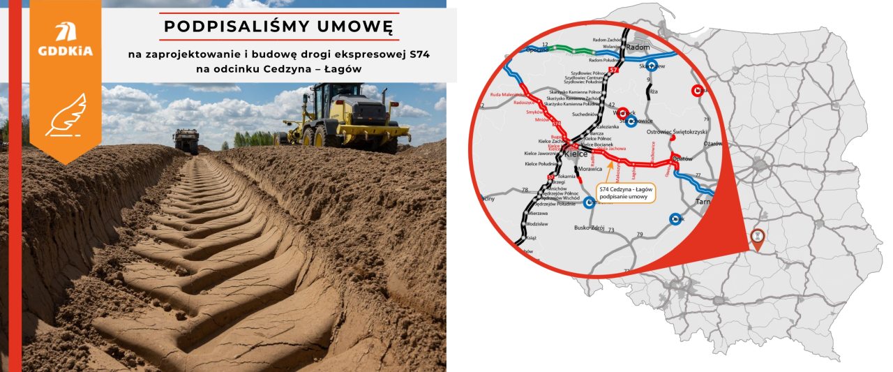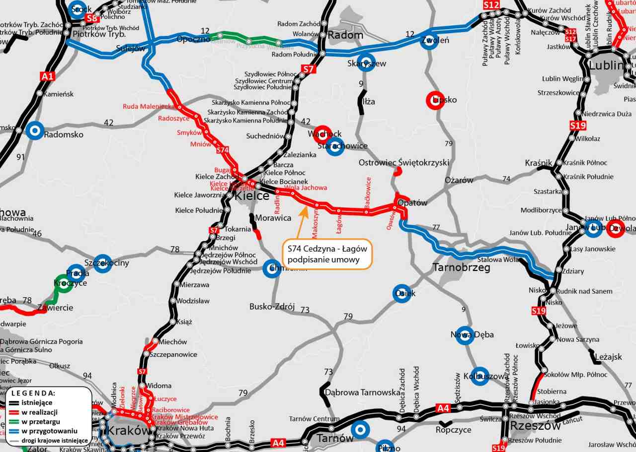 Realizacja S74 Cedzyna - Łagów z obwodnicą Łagowa o długości ok. 30 km to najdroższa inwestycja drogowa w historii województwa świętokrzyskiego i najdłuższy odcinek ekspresowej trasy w regionie. Zgodnie z podpisaną umową wyłoniony w przetargu wykonawca, Mota-Engil Central Europe, zaprojektuje i wybuduje drogę za ok. 1,1 mld złotych w ciągu 39 miesięcy z wyłączeniem okresów zimowych w czasie robót budowlanych. Nową trasą pojedziemy w I kwartale 2028 roku.