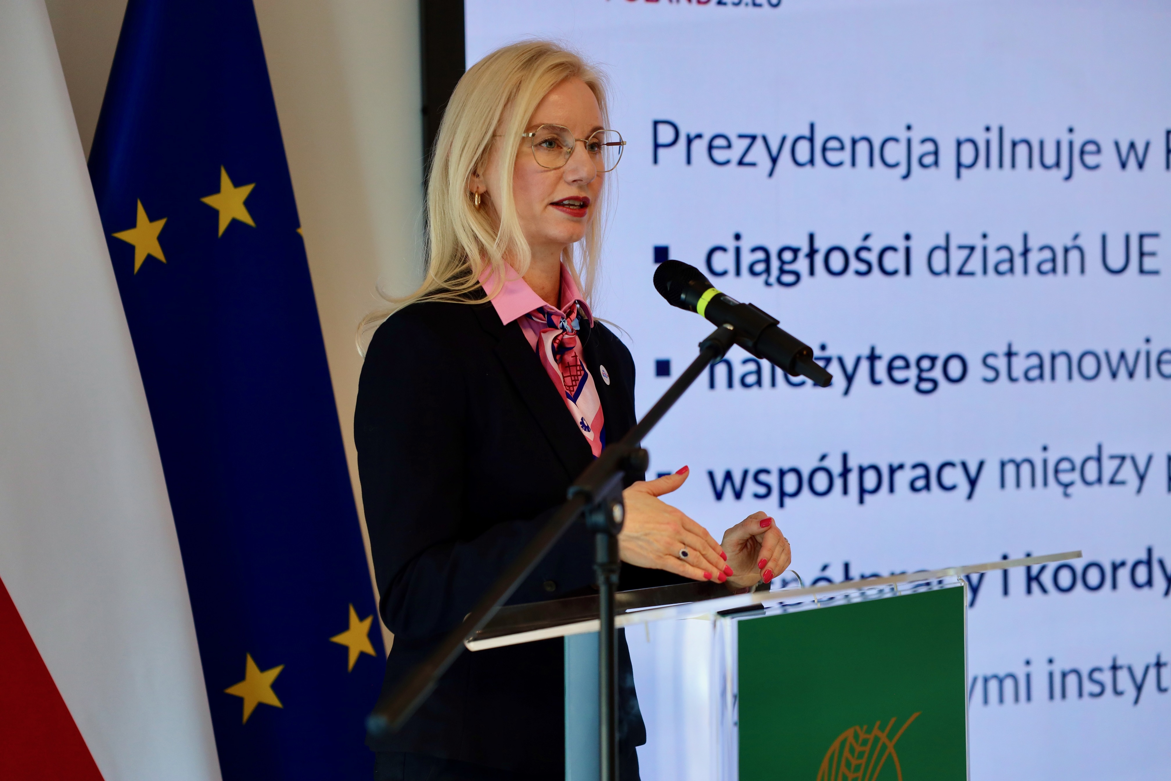Po wystąpieniach ministrów Rzodkiewicza i Krajewskiego Agnieszka Sudoł, zastępca Głównego Inspektora Jakości Handlowej Artykułów Rolno-Spożywczych wyjaśniła młodzieży, jakie wyzwania, korzyści i znaczenie dla Polski wynikają z bieżącej prezydencji w Radzie UE oraz na jakich zasadach działają organy UE.