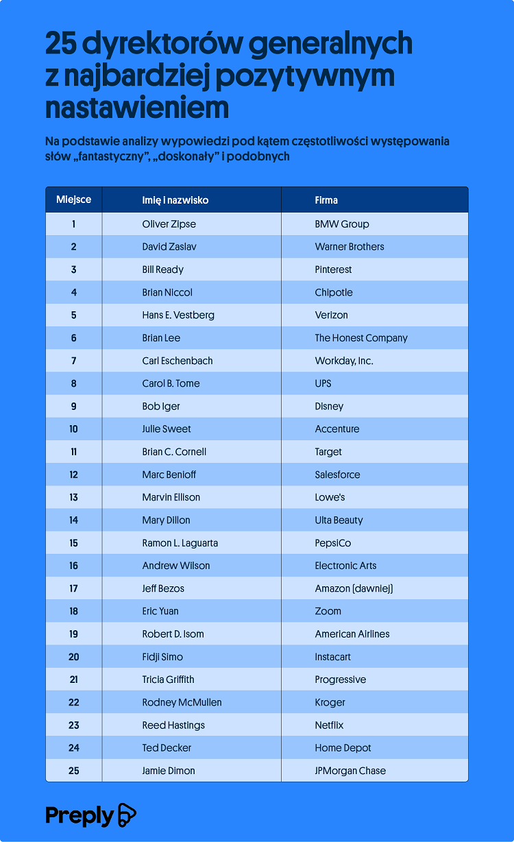 - Przeprowadzone badanie wyłoniło także amerykańskich CEO z najwyższą inteligencją emocjonalną. Dzięki przyjętej metodologii udało się też wskazać szefów, którzy są najmocniej skoncentrowani na zespole i kliencie oraz mają najbardziej pozytywne nastawienie.