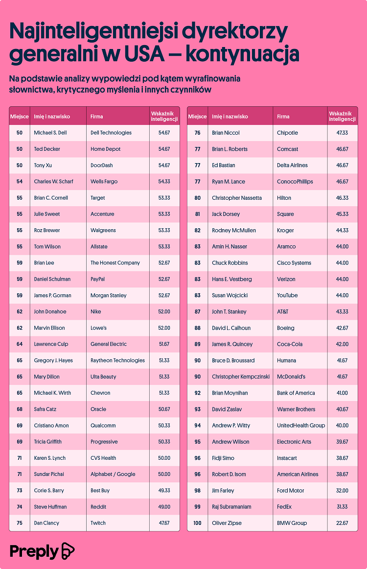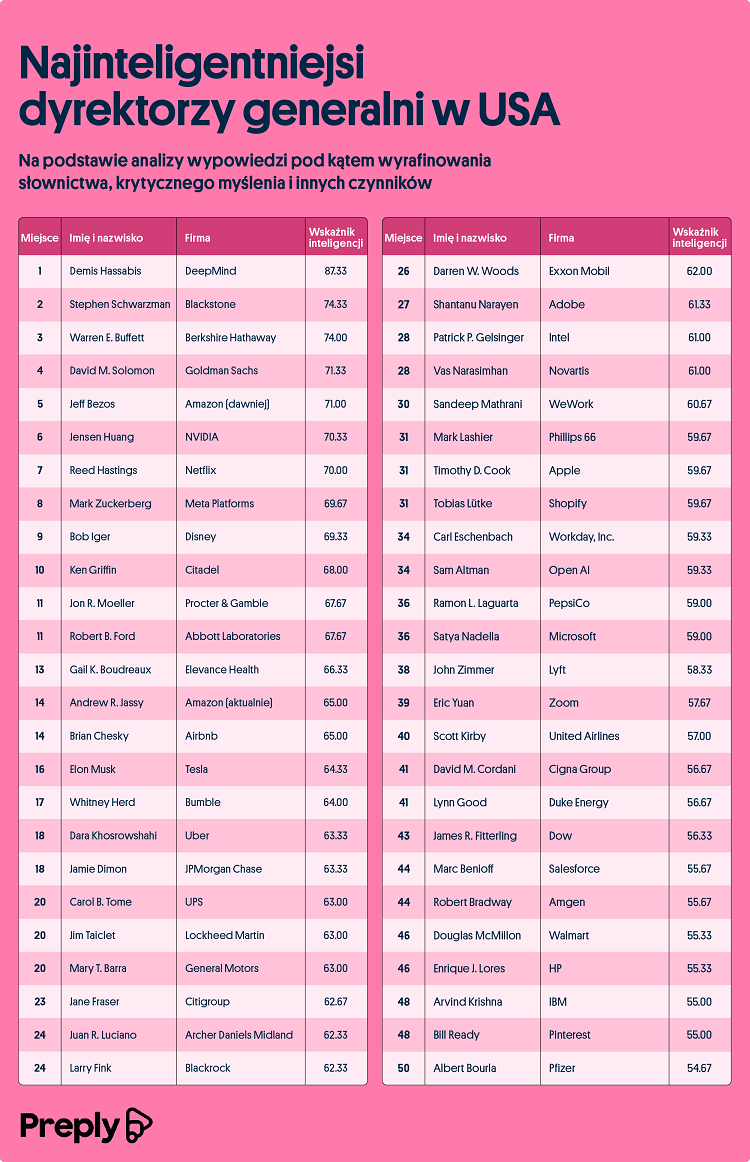 Więcej o inteligencji wśród prezesów zarządów największych korporacji można przeczytać na blogu Preply.