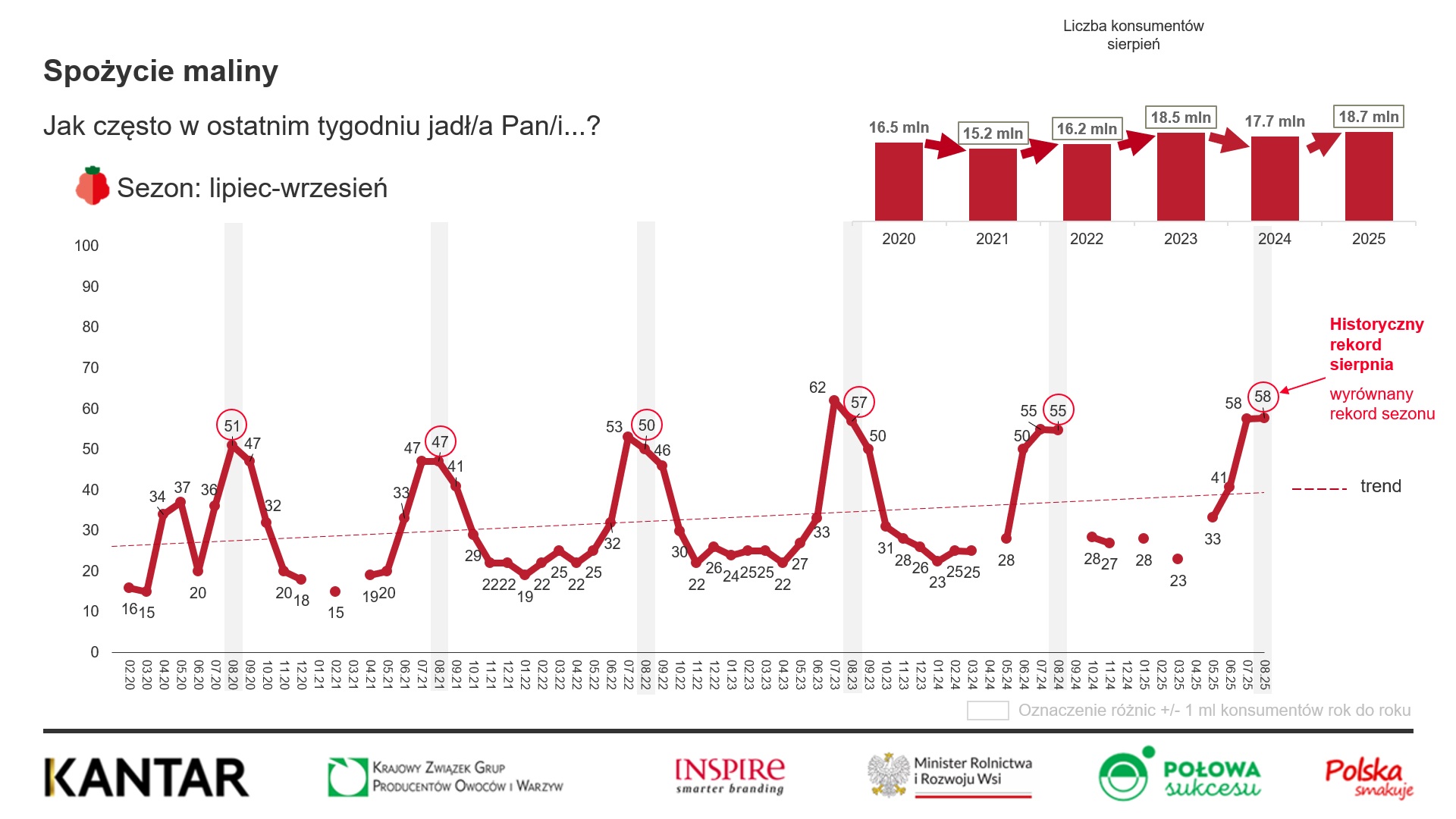 W sierpniu maliny jadło 18,7 mln Polaków. To podobna ilość konsumentów jak w lipcu. Trendy konsumpcji są jednoznaczne - maliny są wśród konsumentów coraz popularniejsze. Wynik 58% jest najwyższym w historii sierpniowych pomiarów, włącznie z okresem wzmożonej konsumpcji owoców w czasie pandemii (2020).