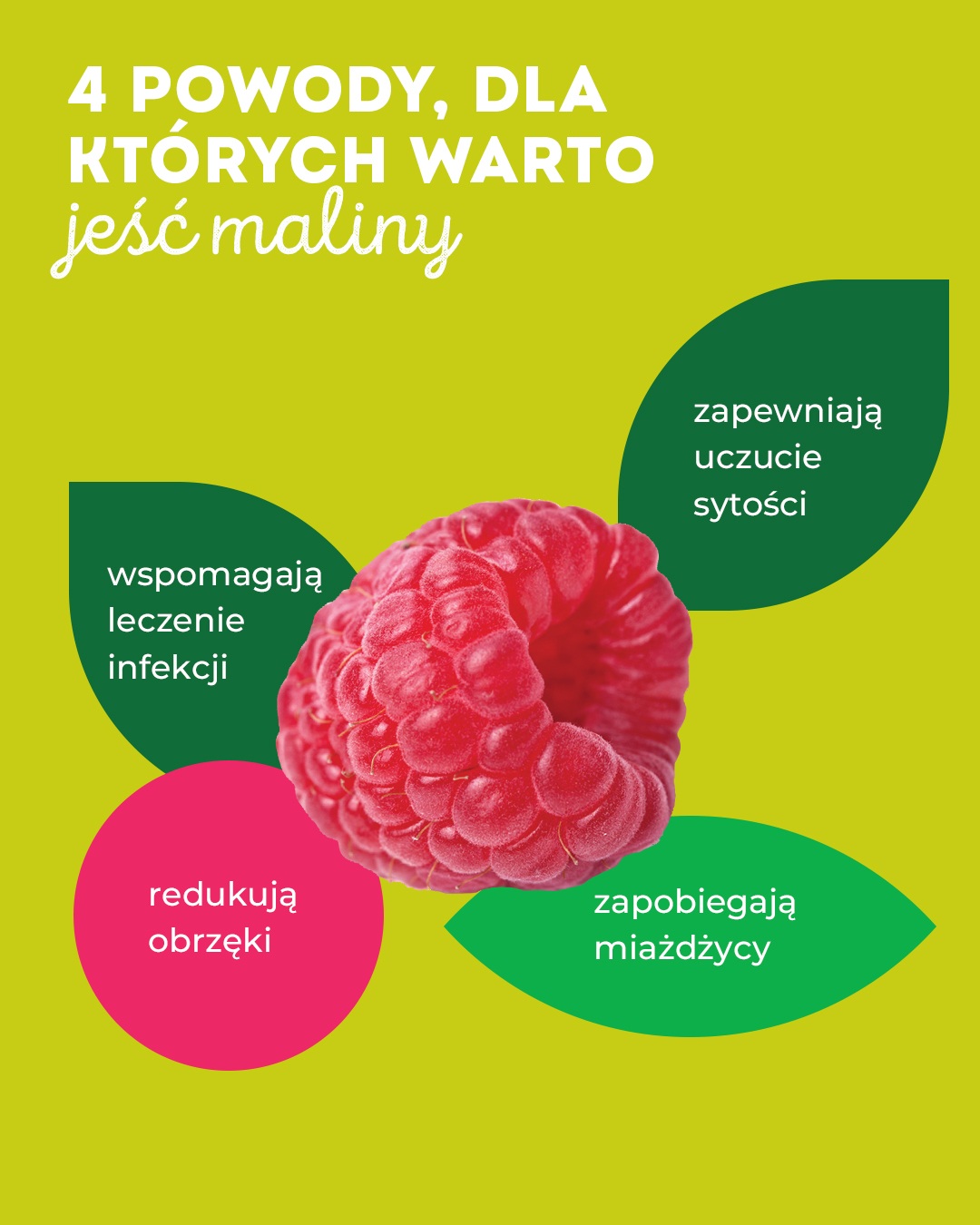 Maliny to potężne źródło witaminy C, błonnika oraz antyoksydantów. Dzięki wysokiej zawartości kwasu elagowego mają silne właściwości przeciwzapalne i przeciwnowotworowe. Regularne spożywanie malin wspomaga odporność organizmu, poprawia trawienie i wpływa korzystnie na zdrowie skóry i pomaga utrzymać dobrą formę. To także owoc o niskiej kaloryczności, idealny dla osób dbających o linię.