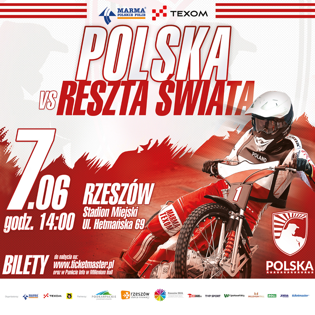 Tego dnia na tor wyjadą najlepsi z najlepszych - Żużlowa Reprezentacja Polski pod wodzą kapitana kadry Bartosza Zmarzlika, którego wspierać będą między innymi Patryk Dudek i Dominik Kubera. Zawodników drużyny Reszty Świata poznamy podczas konferencji prasowej w połowie maja, jednak już teraz wiadomo, że można spodziewać się nazwisk najlepszych żużlowców świata. Zapowiada się wyjątkowe widowisko sportowe z wieloma atrakcjami dla wszystkich, którzy przybędą na rzeszowski stadion. Również dla najmłodszych kibiców będzie przygotowana specjalna strefa zabaw i animacji. Warto się pośpieszyć, ponieważ fanów żużla w Rzeszowie jest wielu.Bilet VIP (miejsca w sektorze F1L) miejsce siedzące z pełną widocznością toru, catering, pamiątkowa koszulka.Organizatorami meczu są Marma Polskie Folie, Texom, Polski Związek Motorowy.
