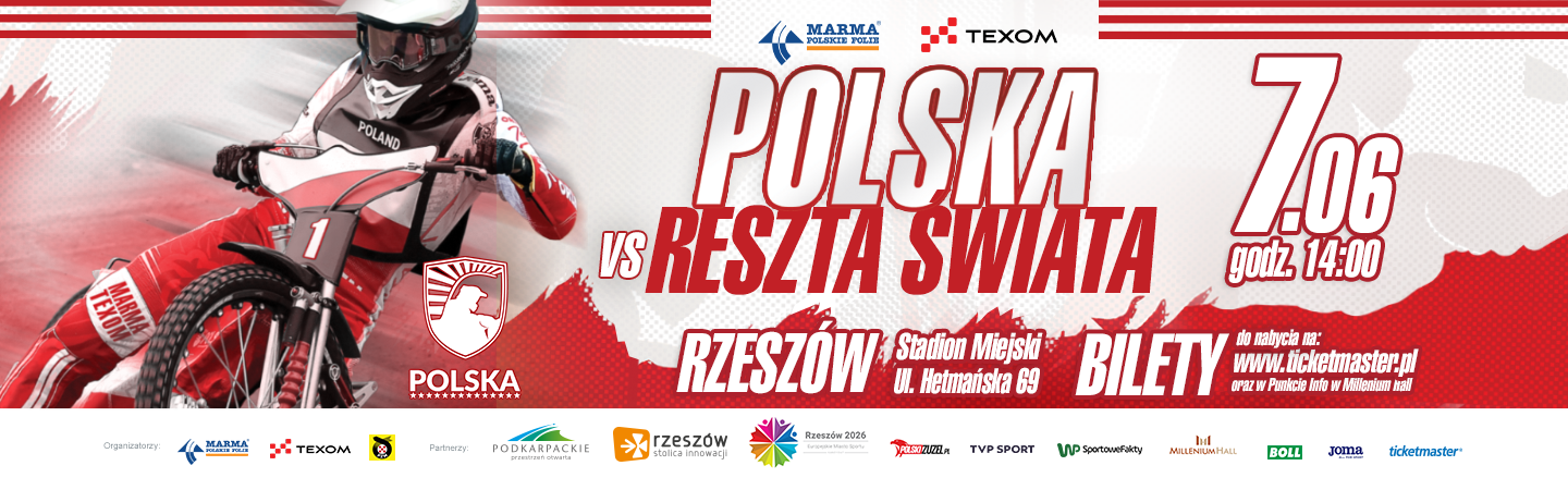 Żużlowe wydarzenie roku już 7 czerwca (sobota) w Rzeszowie: mecz Marma Texom Polska vs Reszta Świata. Na Stadionie Miejskim Żużlowa Reprezentacja Polski stanie do walki z Resztą Świata.
