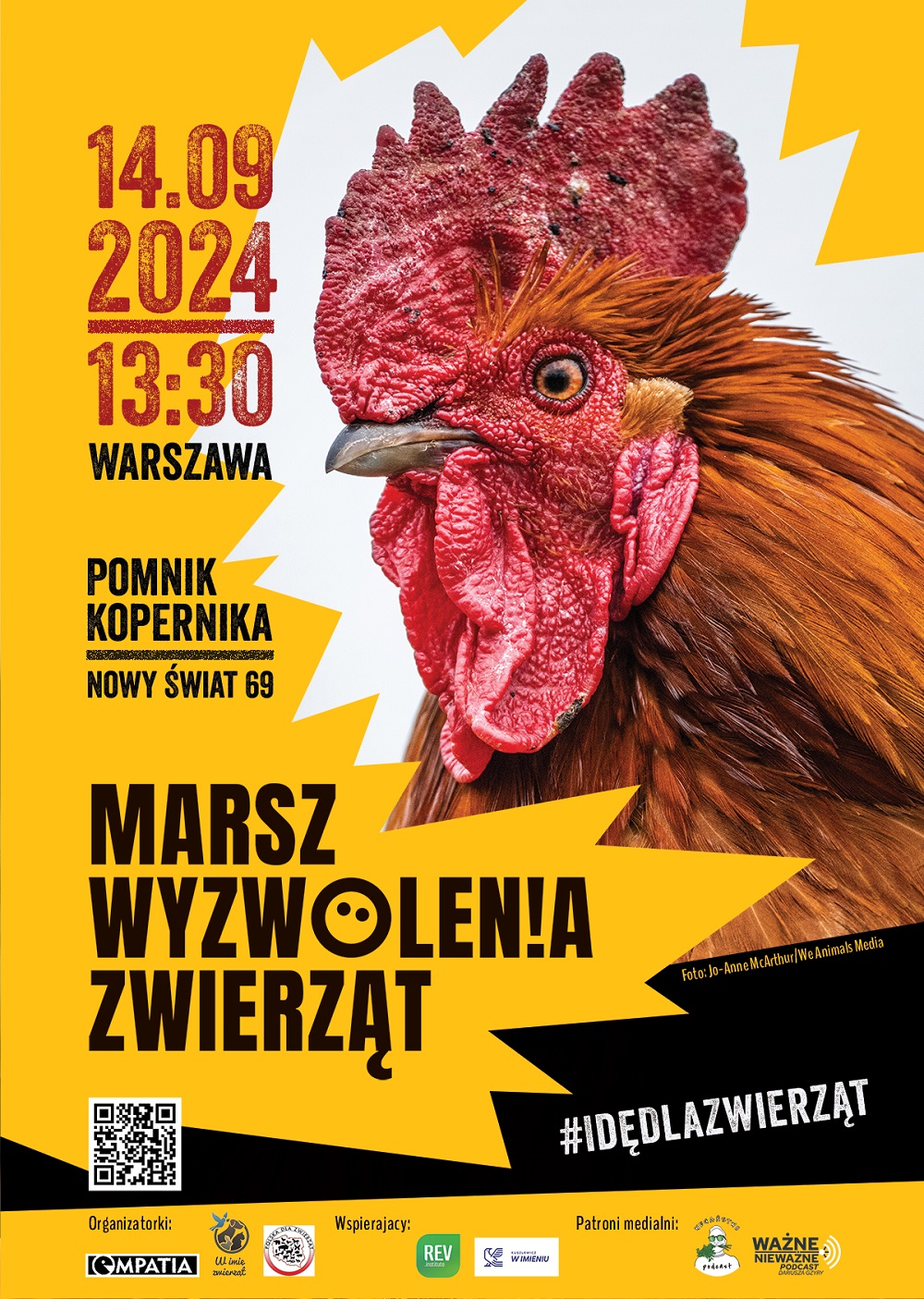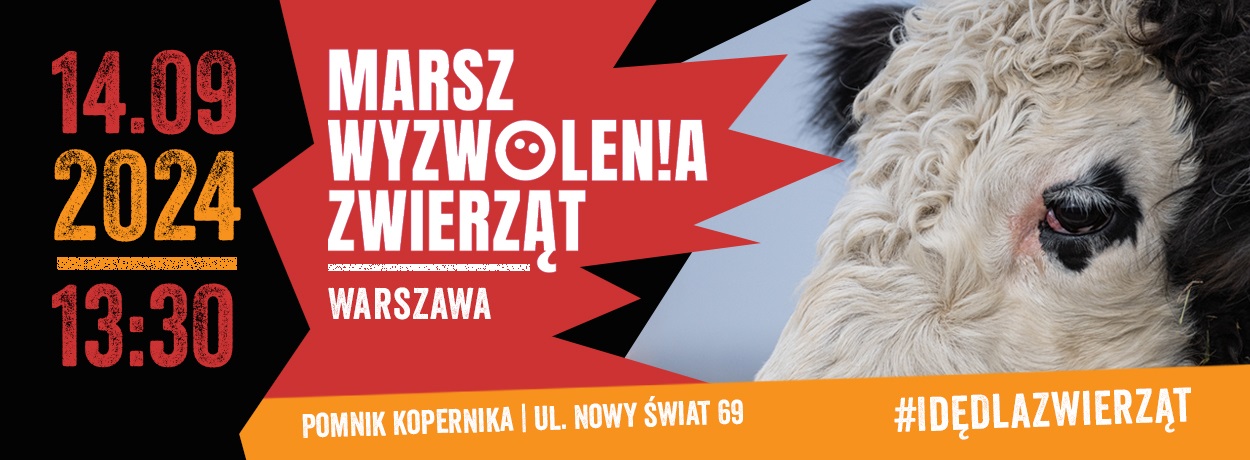 Jest tylko jeden taki marsz w Polsce. Raz do roku. Dla wszystkich czujących zwierząt, uznający ich podmiotowość i prawo do bezpiecznego, godnego życia. 14 września ulicami Warszawy przejdzie Marsz Wyzwolenia Zwierząt - wezmą w nim udział ludzie, dla których los zwierząt pozostaje ważny, w tym aktywiści, prawniczki, naukowcy, etycy, filozofki, przedstawiciele organizacji społecznych i środowisk religijnych. Nie trzeba się zapisywać ani przygotowywać - wystarczy przyjść.