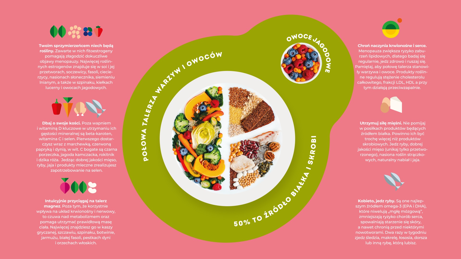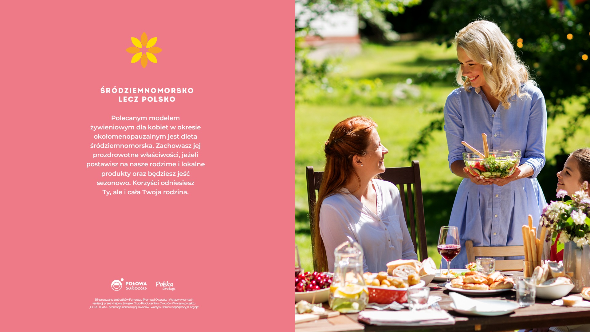 W publikacjach naukowych polecanym modelem żywienia w okresie menopauzy jest dieta śródziemnomorska. Żyjąc w Polsce warto ją zmodyfikować pod nasze warunki i zmienność pór roku. Spolszczony talerz śródziemnomorski powinien w połowie składać się z sezonowych oraz lokalnych warzyw i owoców. A druga jego połówka winna zawierać (powinno być ich trochę więcej niż tych pierwszych!) produkty zbożowe pełnoziarniste jak grube kasze, razowe pieczywo, ale czasem też ziemniaki oraz produkty białkowe, gdyż zapewniają ochronę beztłuszczowej masy ciała.