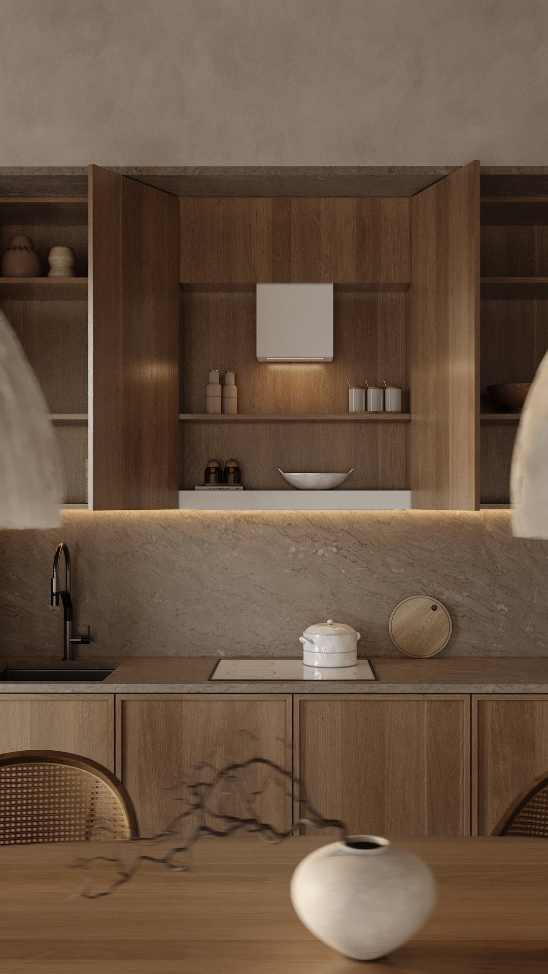 • Efektywne wykorzystanie przestrzeni: zabudowa okapu i dodanie szafek oraz regałów pozwala na maksymalne wykorzystanie dostępnej przestrzeni.