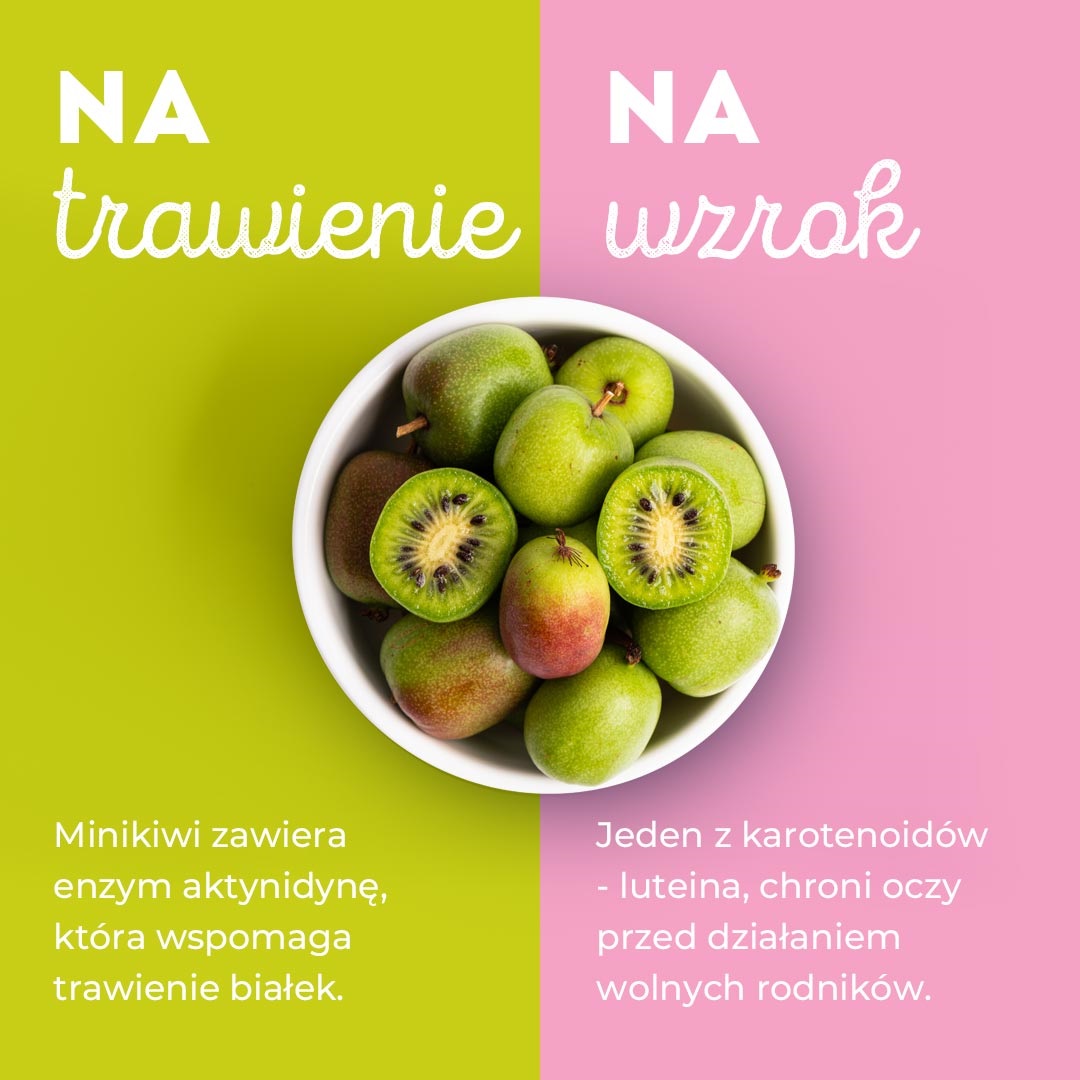 Minikiwi jako jeden z nielicznych owoców zawiera specjalny enzym - aktynidynę, która wspomaga trawienie białek występujących w pokarmach, które spożywamy. Warto minikiwi kończyć posiłek, bo takie zachowanie nie tylko naturalnie zwiększa spożycie owoców, ale może również zapobiec niestrawnościom i długiemu zaleganiu pokarmu w żołądku.