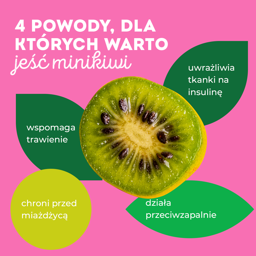 Dzięki temu, że minikiwi zjadamy ze skórką, jest to fantastyczne źródło błonnika, który wspomaga trawienie, pomaga w odchudzaniu, zapobiega zaparciom, a - jak wskazują najnowsze badania - może również wspierać usuwanie tzw. wiecznych chemikaliów (PFAS). To związki chemiczne, które nie rozkładają się naturalnie i mogą kumulować się w organizmie przez wiele lat. Trafiają do naszego ciała m.in. z żywnością - szczególnie tą pakowaną w plastik, butelkowaną wodą i napojami, z ubraniami z poliestru czy kosmetykami. Ich obecność związana jest z ryzykiem podwyższonego cholesterolu, zaburzeń hormonalnych, osłabionej odporności, a także niektórych nowotworów.