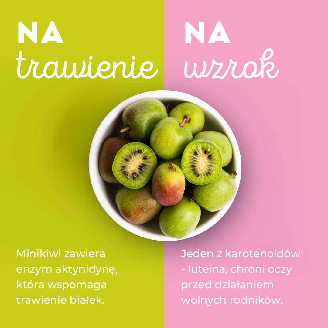 Minikiwi to także cenne źródło luteiny - naturalnego barwnika należącego do grupy karotenoidów. Luteina znana jest przede wszystkim z korzystnego wpływu na zdrowie oczu - pomaga utrzymać prawidłowe funkcjonowanie siatkówki, zmniejsza ryzyko rozwoju zaćmy oraz zwyrodnienia plamki żółtej (AMD), które są jednymi z głównych przyczyn pogorszenia widzenia wraz z wiekiem.