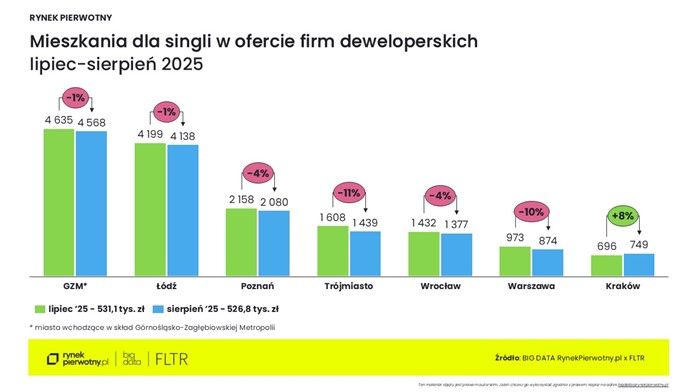 Z danych BIG DATA RynekPierwotny.pl wynika, że spadek zdolności kredytowej singielek i singli, zawęził im pole poszukiwań. Szczególnie w Trójmieście i Warszawie, gdzie pula mieszkań w cenie do 526,8 tys. zł skurczyła się odpowiednio aż o 11% i 10%. Wyjątkiem był Kraków, bo takich lokali deweloperzy więcej „dosypali” w sierpniu do oferty niż sprzedali. Mimo to wybór wciąż jest tam najmniejszy (niespełna 750 lokali). Największy był natomiast w miastach wchodzących w skład Górnośląsko-Zagłębiowskiej Metropolii (blisko 4,6 tys. lokali z ujawnioną ceną) oraz w Łodzi (ponad 4,1 tys.). Dodatkowo, są to metropolie, w których ceny mieszkań są najniższe. Niestety, w obu pula mieszkań dostępnych dla przeciętnie zarabiających singli i singielek kredytobiorców skurczyła się w ciągu ostatniego miesiąca o 1%. Z kolei o 4% zmniejszyła się w Poznaniu (do ok. 2,1 tys. lokali) oraz we Wrocławiu (do niespełna 1,4 tys.).