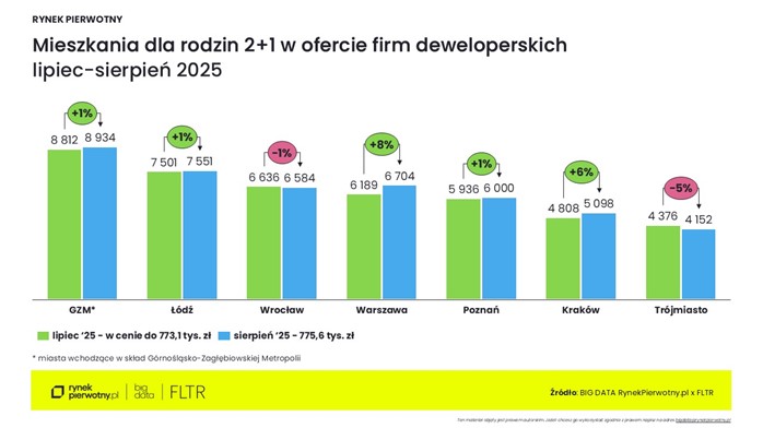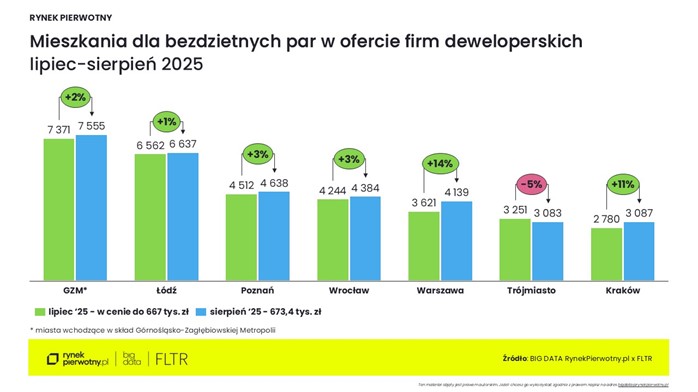 Zdaniem Marka Wielgo, eksperta portalu RynekPierwotny.pl, w lepszej sytuacji są bezdzietne pary, bo w sierpniu mogły liczyć na nieco wyższy kredyt w porównaniu z lipcem. W efekcie zwiększył się też wybór mieszkań. Największy wzrost liczby lokali z ujawnioną ceną poniżej 673,4 tys. zł miał miejsce w Warszawie. Pod koniec sierpnia było ich tam w ofercie firm deweloperskich przeszło 4,1 tys. (+14%). O 11% zwiększyła się ona w Krakowie (do ok. 3,1 tys. lokali), choć wciąż jest najmniejsza wśród największych metropolii. W pozostałych poprawa dostępności mieszkań nie była tak spektakularna. We Wrocławiu gospodarstwa dwuosobowe mogły przebierać w blisko 4,4 tys. mieszkań (+3%), w Poznaniu – ok. 4,6 tys. (+3%). Tradycyjnie najwięcej było ich w GZM (blisko 7,6 tys.) oraz w Łodzi (przeszło 6,6 tys.), gdzie oferta firm deweloperskich wzrosła o odpowiednio 2% i 1%. Niestety, także w tym przypadku „czarną owcą” okazało się Trójmiasto. Ta metropolia była jedyną, w której oferta skurczyła się do niespełna 3,1 tys. mieszkań (-5%).
