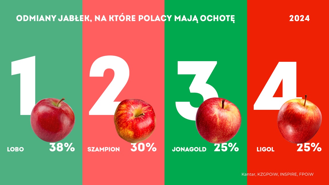 Jedno jabłko dziennie jest zachętą do regularnej konsumpcji, ale kluczem do sukcesu jest atrakcyjność konkretnych odmian. Oto odmiany jabłek, po które Polacy mają ochotę sięgnąć w najbliższej przyszłości. Informacji dostarczył sondaż omnibusowy realizowany przez Kantar Polska, reprezentatywny dla populacji dorosłych Polaków w wieku 15+.