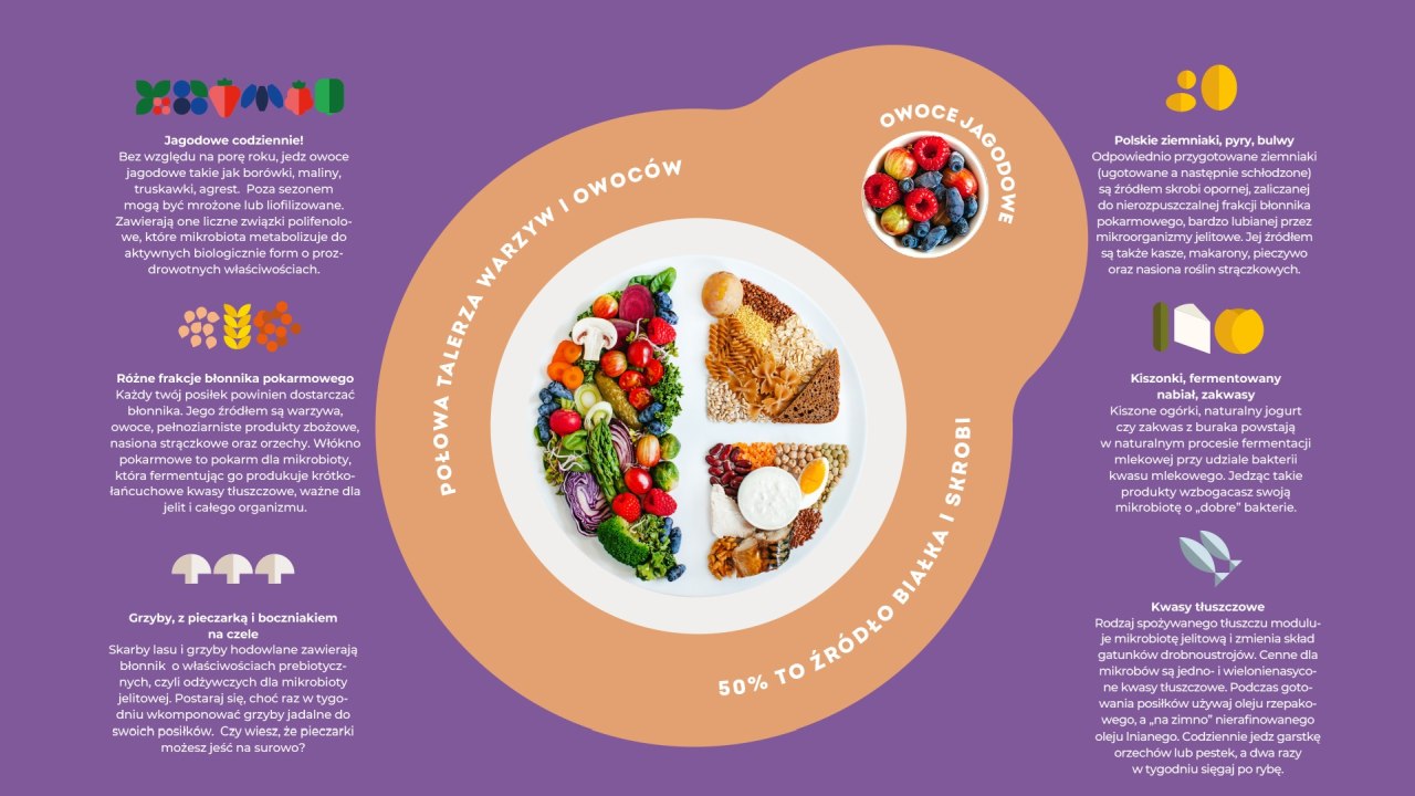 Mikrobiota jelitowa to wszystkie mikroorganizmy - bakterie, wirusy, grzyby - zasiedlające przewód pokarmowy człowieka. Dzisiejszy stan wiedzy pozwala stwierdzić, że stan mikrobioty jest podstawą naszego zdrowia. Rozregulowanie jej na skutek przyjmowanych leków, „śmieciowego jedzenia” czy stresu zwiastuje problemy. Jest jednak na to sposób. Sprawdź, co jeść, aby dobrze karmić korzystne mikroorganizmy i zachować zdrowie. Oto pełne rekomendacje opracowane w formie modnego talerza żywieniowego.