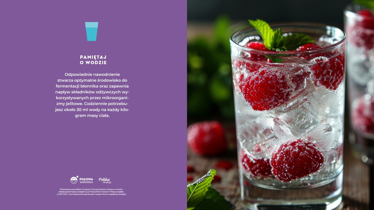 Odpowiednie nawodnienie stwarza optymalne środowisko do fermentacji błonnika, którego dostarczamy, oraz zapewnia napływ składników odżywczych wykorzystywanych przez mikroorganizmy. Zapotrzebowanie na płyny wynosi około 30 ml/kg masy ciała, ale w czasie wysiłku fizycznego czy upałów może się zwiększyć. Wody dostarczają także warzywa, owoce, płynny nabiał oraz zupy.