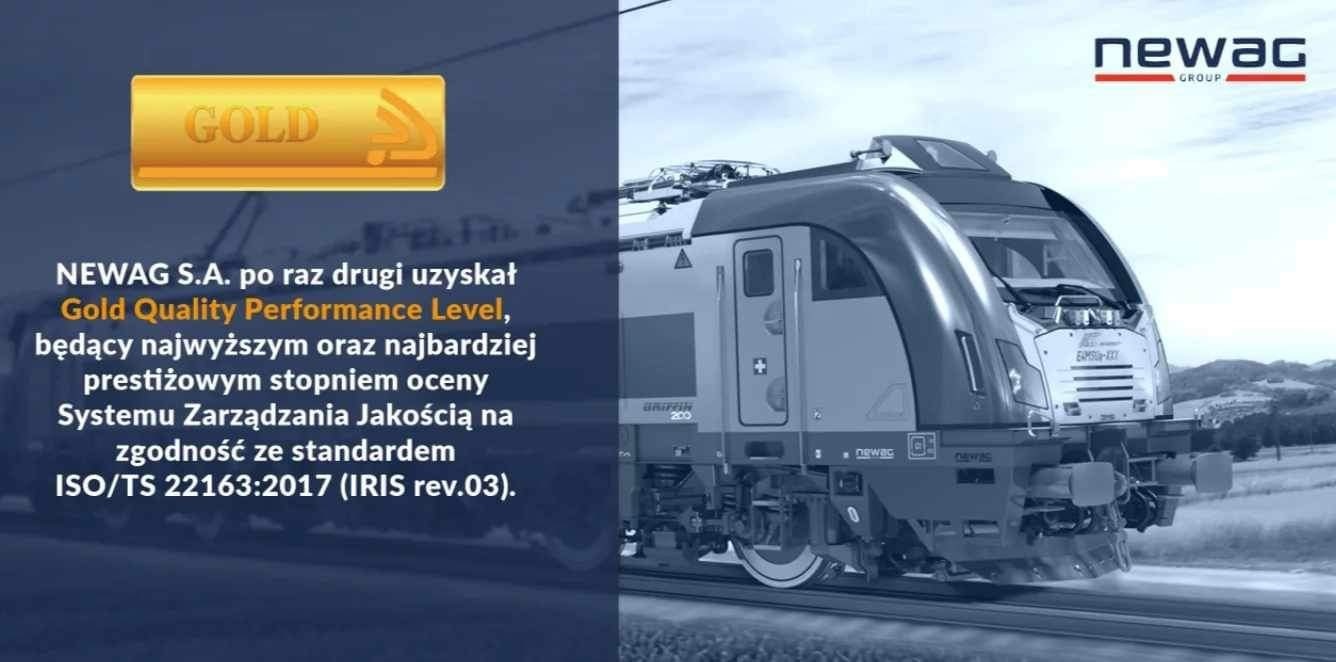 NEWAG S.A. - wiodący producent taboru kolejowego - po raz drugi uzyskał Gold Quality Performance Level, będący najwyższym oraz najbardziej prestiżowym stopniem oceny Systemu Zarządzania Jakością na zgodność ze standardem ISO/TS 22163:2017 (IRIS rev.03).