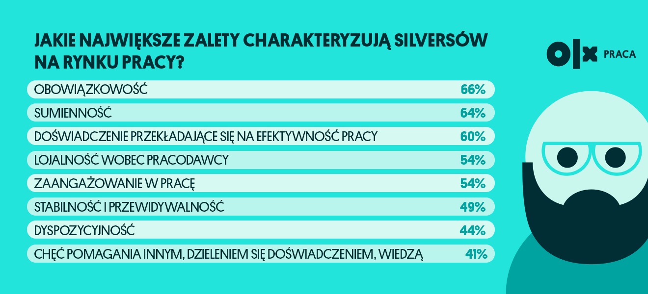 Silversi okazują się być dużo bardziej wartościowymi pracownikami niż się nam wydaje. We wspomnianym już badaniu Mind&Roses dla OLX Praca, na pytanie o chęci do pracy, aż trzech na czterech ankietowanych pracowników 50+ stwierdziło, że doceniają swoją pracę, która jest dla nich dużą wartością i chętnie dzielą się swoim doświadczeniem z młodszymi kolegami (71 proc.).