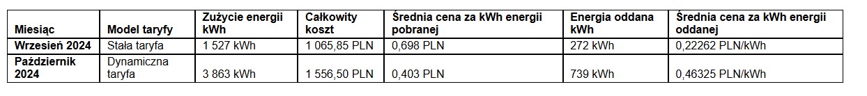 Poniższa tabela przedstawia szczegółowe dane dotyczące zużycia energii i kosztów w dwóch modelach taryfowych.