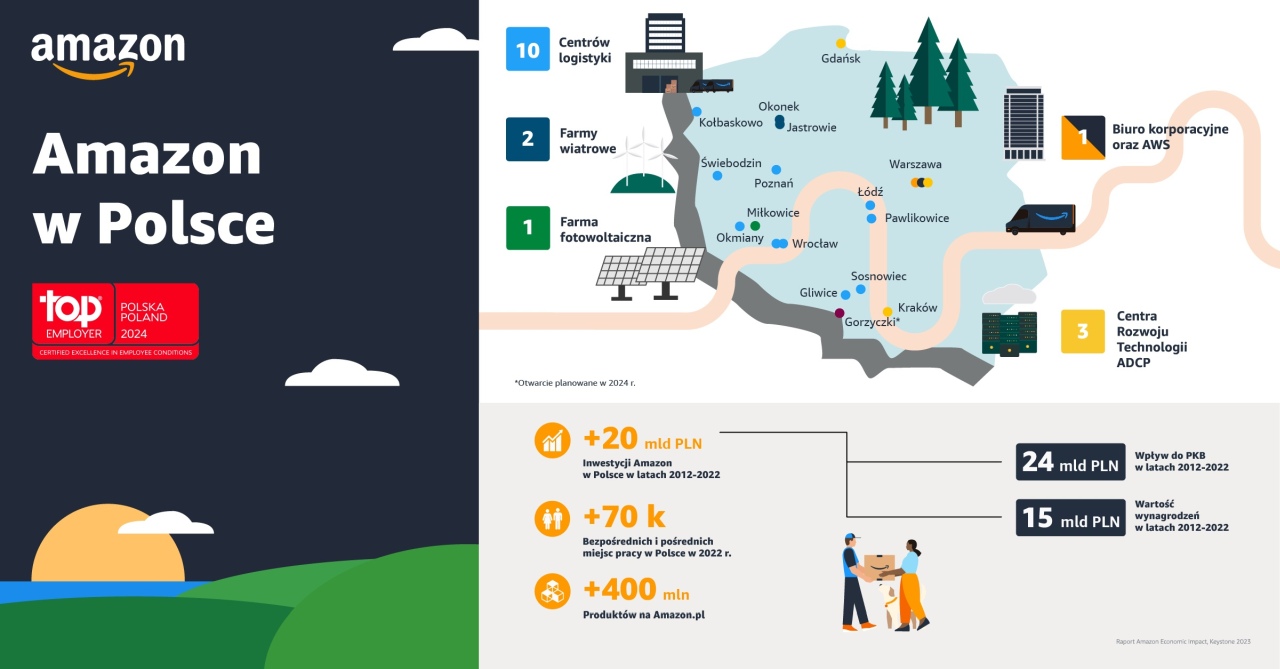 Amazon działa w Polsce od 2014 r. Tylko w 2022 roku stworzył i wspierał ponad 70 000 bezpośrednich i pośrednich miejsc pracy, m.in. w 10 nowoczesnych centrach logistycznych, a także w biurze Amazon Web Services (AWS) w Warszawie oraz w Amazon Development Center Poland (ADCP) w Gdańsku, Krakowie i Warszawie. ADCP to pionierskie ośrodki naukowo-badawcze, w których zespoły menedżerek i menedżerów, inżynierek i inżynierów, naukowczyń i naukowców tworzą i rozwijają globalne najbardziej zaawansowane technologie Amazon, takie jak: Alexa, Ring czy Kindle. Amazon wspiera również zatrudnienie w łańcuchu dostaw, u partnerów wspierających operacje Amazon, a także miejsca pracy stworzone przez MŚP, które prowadzą sprzedaż za pośrednictwem sklepu Amazon.pl, docierając do setek milionów klientów na całym świecie. W latach 2012-2022 Amazon zainwestował w Polsce ponad 20 mld zł w infrastrukturę, w tym m.in. centra logistyczne, biura korporacyjne i zaplecze technologiczne, jak i wynagrodzenia oraz rozwój usług dla klientów. Miliardy dolarów przeznaczył również na rozwój infrastruktury i technologii, które pomagają MŚP docierać do nowych klientów w kraju i za granicą, w tym również na ochronę własności intelektualnej marek.