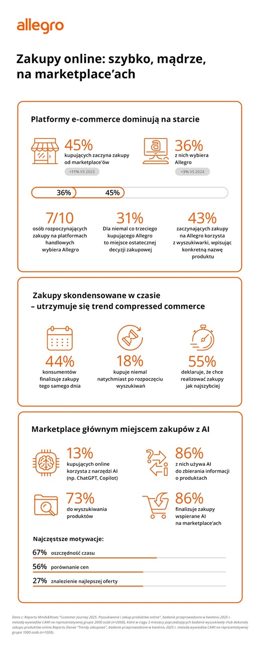 Znaczenie platform e-commerce w kontekście ścieżki zakupowej rośnie - wynika z raportu „Customer Journey 2025. Poszukiwanie i zakup produktów online” [1], przygotowanego przez Minds&Roses na zlecenie Allegro. Już 45% kupujących zaczyna zakupy od marketplace’ów (+11 p.p. vs 2023 r.). Liderem pozostaje Allegro, które wybiera 7 na 10 osób rozpoczynających zakupy na platformach. Nadal silny jest trend „compressed commerce”, czyli zakupów maksymalnie skróconych i skondensowanych w jednym miejscu. Aż 44% konsumentów finalizuje transakcję jeszcze tego samego dnia, a blisko 1/5 decyduje się na zakup od razu.