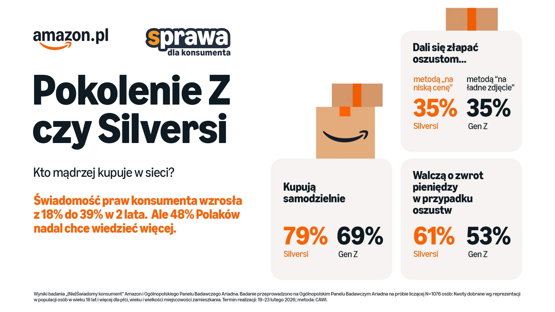 Jak różni się podejście do zakupów online dwudziestolatka i pięćdziesięciolatka? Odpowiedzi dostarcza kolejna edycja badania „(Nie)Świadomy konsument” - cyklicznego projektu Amazon, który w tym roku po raz pierwszy stawia w centrum uwagi różnice pokoleniowe między generacją Z (18-29 lat) a silversami (50+). Badanie przeprowadzone zostało na całościowej, reprezentatywnej grupie Polaków w celu porównania wyników do poprzednich lat.