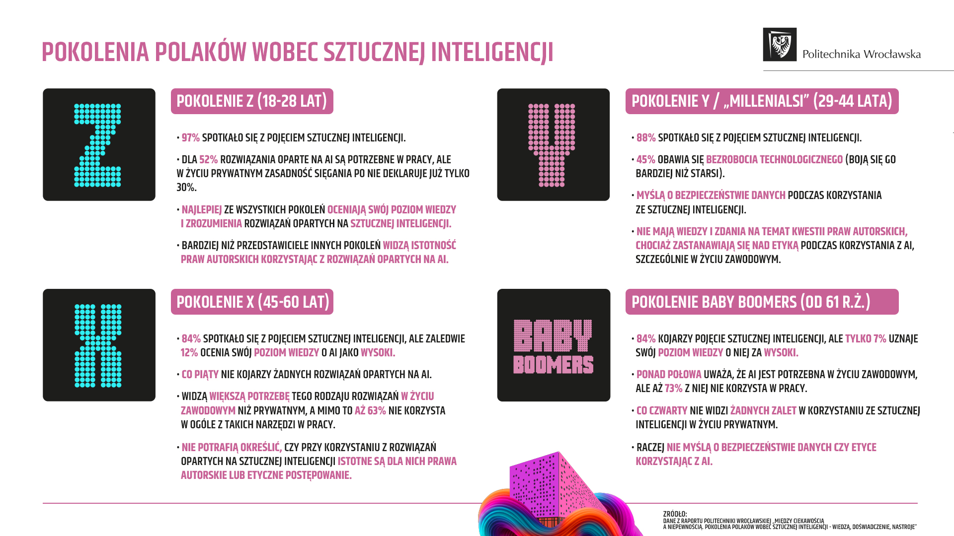 „Z zebranego materiału badawczego wyłania się zróżnicowany obraz polskiego społeczeństwa, które wciąż niewiele wie o rozwiązaniach opartych na AI i nie do końca rozumie sposób jej działania. Nadzieją napawa jednak fakt, że mimo poczucia niepewności, każda z generacji dostrzega potencjał w rozwoju sztucznej inteligencji i deklaruje otwartość na zgłębianie wiedzy na jej temat” - mówi prof. Kamil Staniec, prorektor ds. kształcenia Politechniki Wrocławskiej - inicjatora badania.