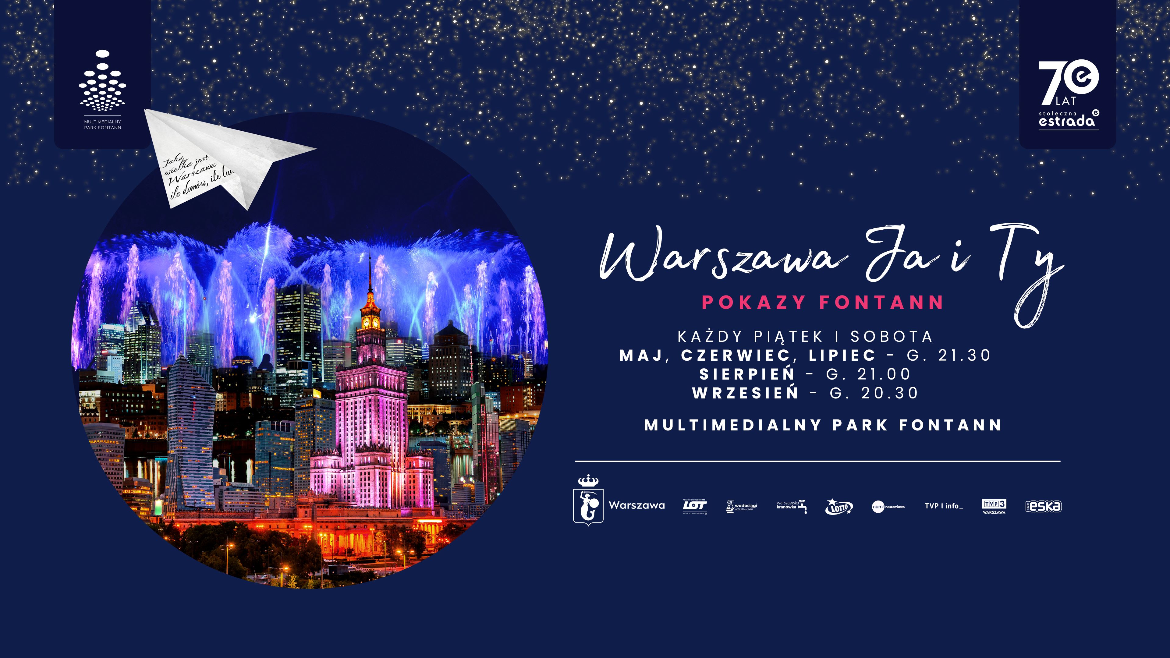 Tegoroczny cykl spektakli wodnych i świetlnych będzie hołdem dla stolicy i jej mieszkańców. Pokazy opowiedzą historię Warszawy odradzającej się z ruin oraz tej dzisiejszej, pełnej pozytywnej energii, widzianej oczami artystów, poetów i zwykłych warszawiaków. Oprawa wizualna, synchronizacja fontann i laserów stworzą niezapomniane widowisko, któremu towarzyszyć będą polskie utwory muzyczne i poetyckie opisy miasta, m.in. autorstwa Juliana Tuwima. Podczas seansów nie zabraknie także Polskich Linii Lotniczych LOT, które w 30-sekundowym filmie zaprezentują jedne z najbardziej ulubionych kierunków pasażerów oraz ostatnie nowości w siatce połączeń. Pokazy będą odbywać się w każdy piątek i sobotę o godzinie 21:30 (od maja do czerwca), o 20:00 (w sierpniu) oraz od 20:30 (we wrześniu). Wstęp na pokazy w Multimedialnym Parku Fontann jest bezpłatny dla wszystkich.