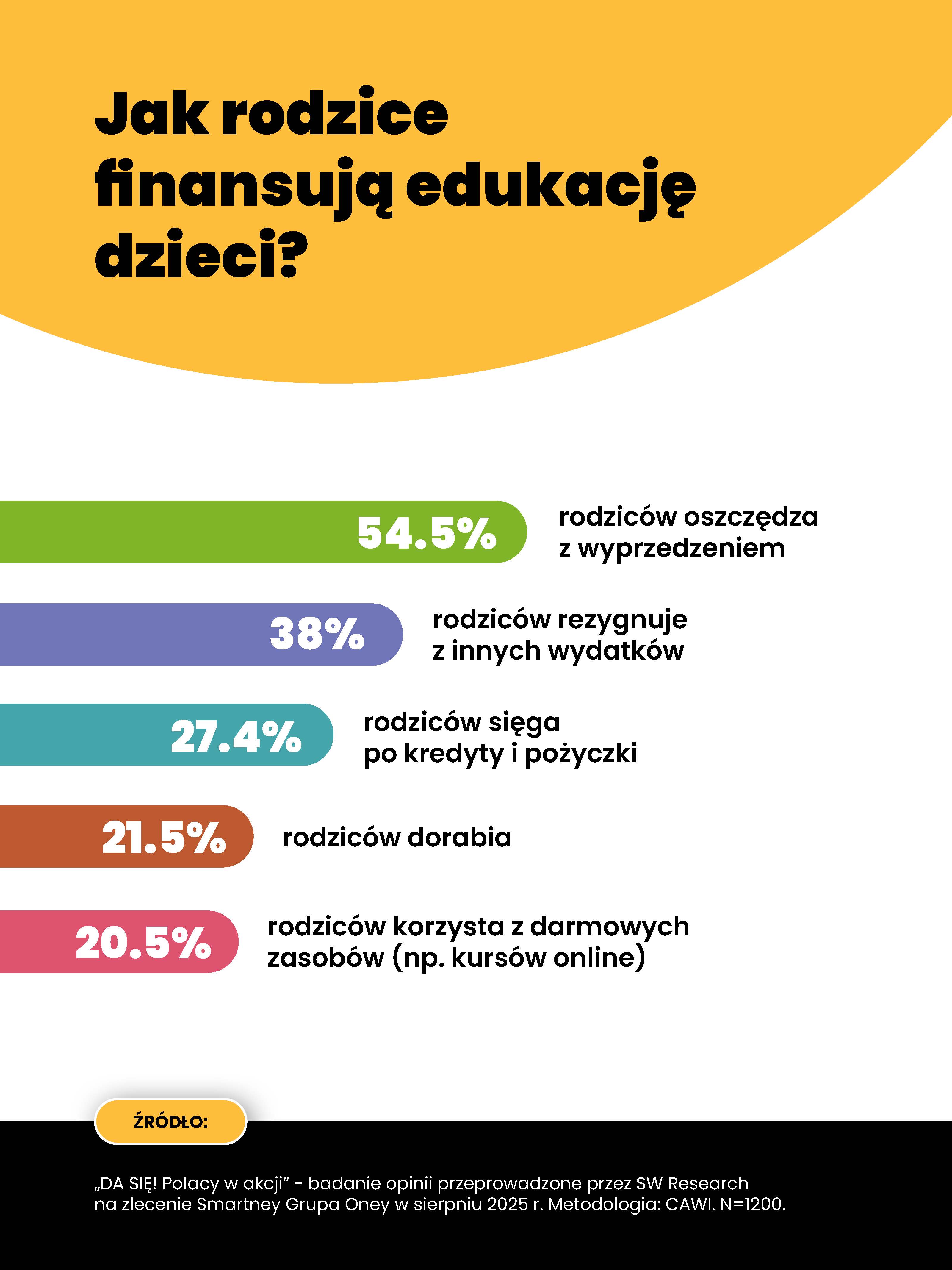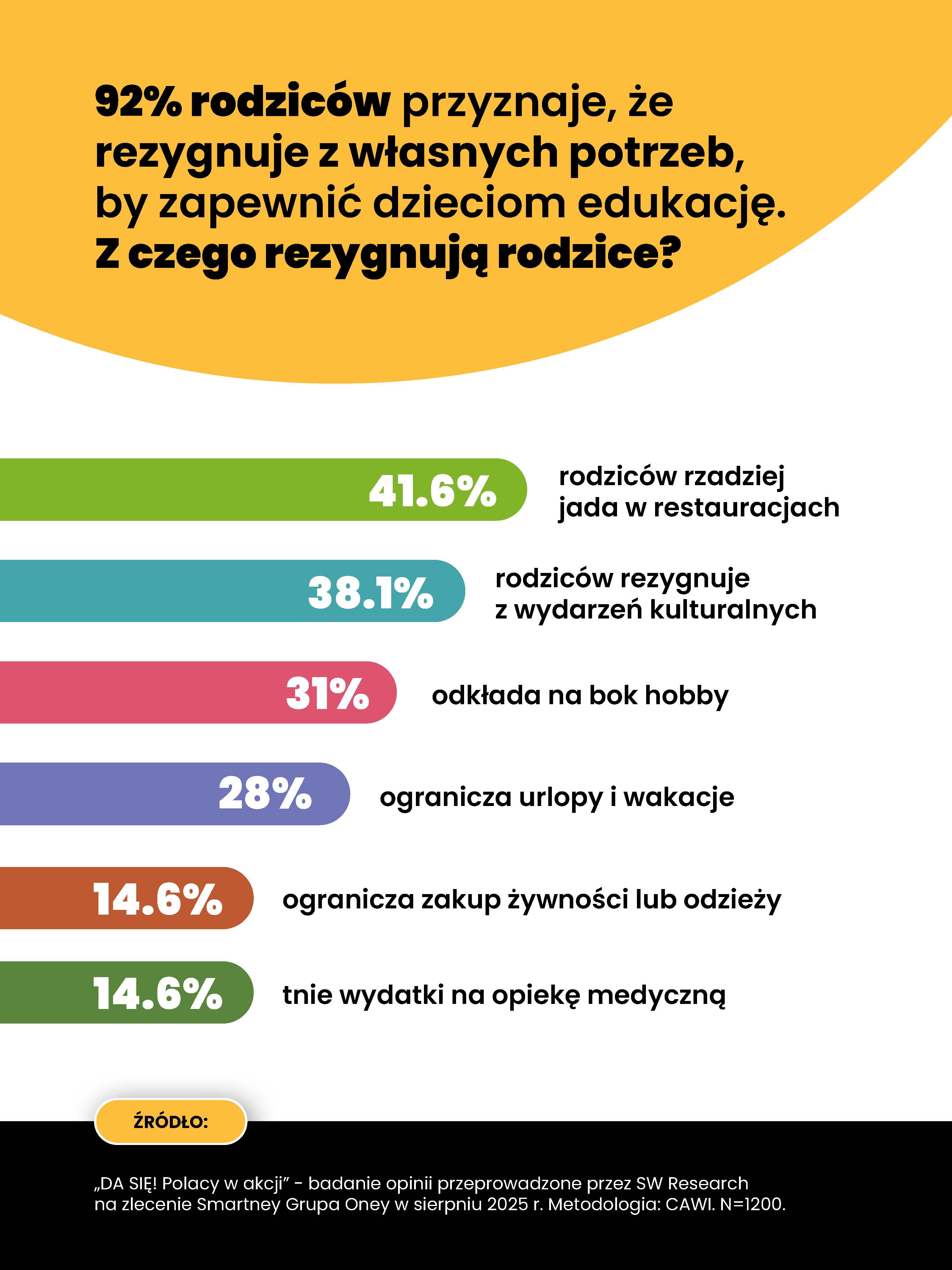 Wakacje, koncerty, hobby, a czasem nawet jedzenie czy lekarz - to wydatki, z których Polacy najczęściej rezygnują, by sfinansować edukację dzieci. Najnowsze badanie „DA SIĘ! Polacy w akcji” Smartney Grupa Oney pokazuje, że rozwój najmłodszych jest dla rodziców priorytetem. Ponad 80% Polaków przyznaje, że niedobory finansowe ograniczają ich plany życiowe. Jednocześnie blisko 90% rodziców wydaje pieniądze na edukację pozaszkolną dzieci. Koszty zajęć sportowych, językowych czy korepetycji nierzadko sięgają 1000 zł miesięcznie [1].