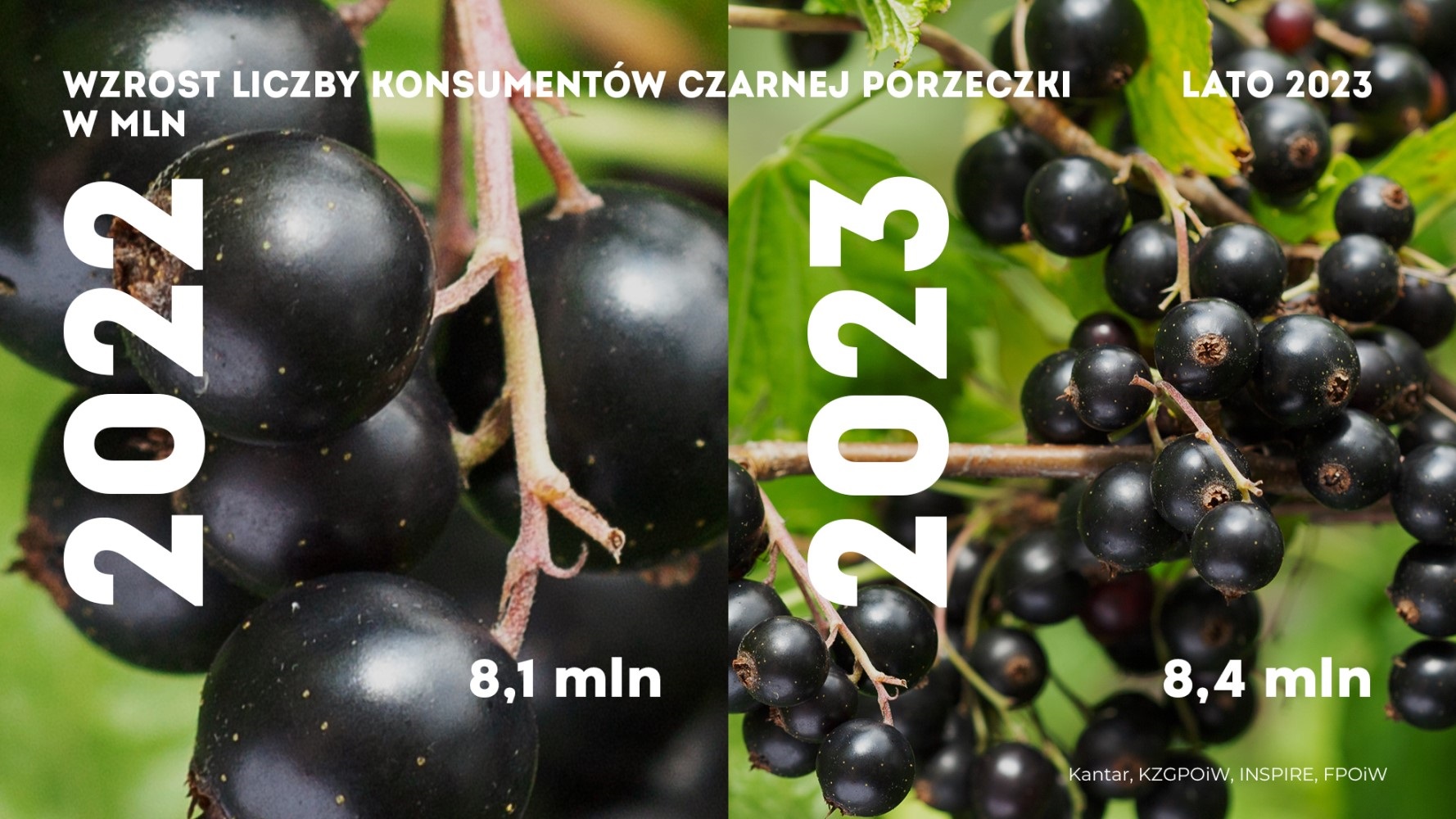 W porównaniu z latem 2022 roku czarnej porzeczce i jej przetworom przybyło 1,9 mln nowych konsumentów. Więcej konsumentów zyskała tylko malina. W skali 3 lat, w porównaniu „lato 2020 do lata 2023 roku”, deklaracje spożycia czarnej porzeczki i jej przetworów wzrosły o 63%, z 5,2 mln do 8,4 mln konsumentów. Jedynie w przypadku jeżyn wzrost był wyższy i wyniósł 75%, liczba konsumentów wzrosła z 5,2 mln do 9,1 mln. Duży był także wzrost liczby konsumentów aronii i jej przetworów od 2020 r. - wyniósł 46%.