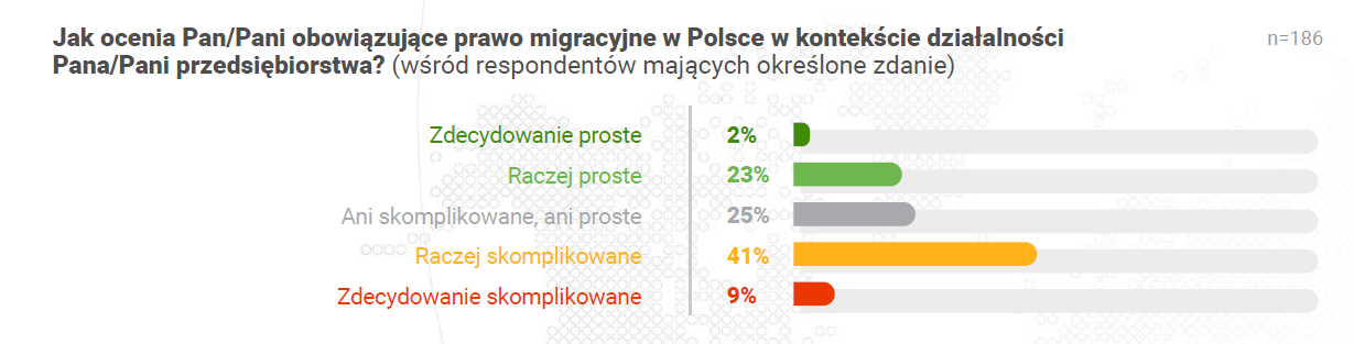 Jednak w dążeniu do tego celu firmy napotykają istotne bariery. Obowiązujące polskie przepisy migracyjne są oceniane jako skomplikowane przez połowę (50%) ankietowanych pracodawców. Jedynie 25% respondentów uznaje je za proste, co uwypukla konieczność wprowadzenia bardziej jasnych i trwałych procedur.