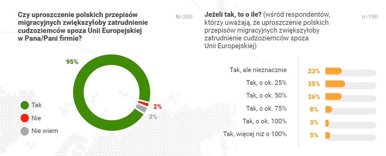 Niemal wszyscy ankietowani pracodawcy (95%) są zgodni, że usprawnienie i ustabilizowanie polskich przepisów prawa migracyjnego mogłyby znacząco przyspieszyć proces zatrudniania obcokrajowców.