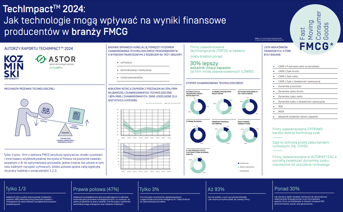 Akademia Leona Koźmińskiego oraz firma ASTOR zaprezentowały wyniki raportu TechImpact™ 2024. Wskazuje on, że polskie firmy FMCG inwestujące w cyfryzację i automatyzację lepiej kontrolują zyskowność, mają lepszy zwrot na aktywach operacyjnych (ROOA) oraz nawet o 30% korzystniejszy wskaźnik rotacji zapasów. Mimo to aż 47% przedsiębiorstw dopiero rozpoczyna automatyzację, a tylko 30% w pełni korzysta z systemów MES do zarządzania produkcją. Ponadto ponad 30% firm nie optymalizuje zużycia energii, a jedynie 3% stosuje algorytmy AI.