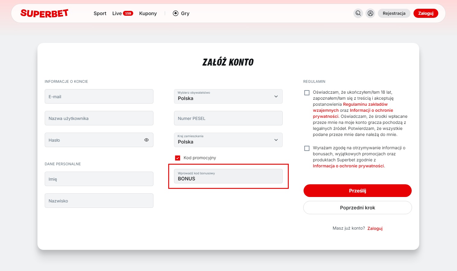 1. Wejdź na stronę: https://superbet.pl/rejestracja?bonus=BONUS.