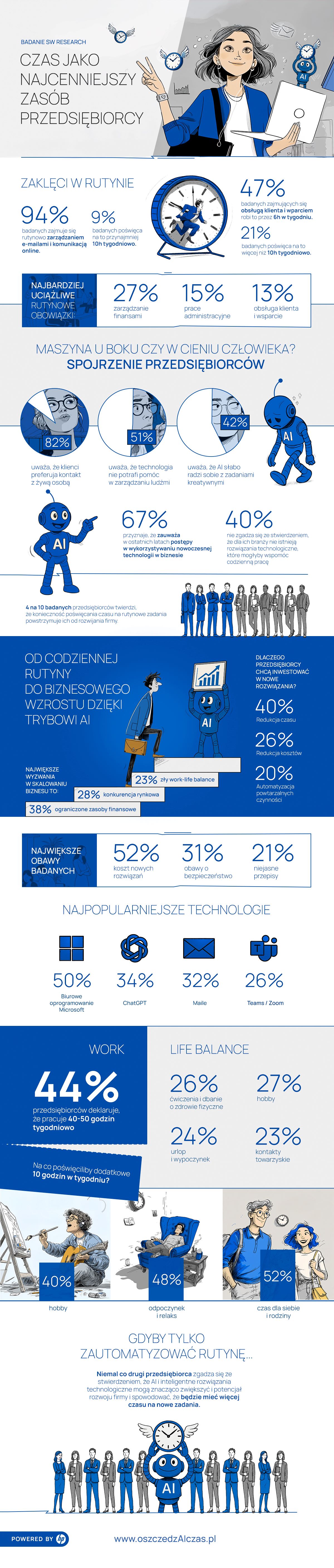 Z najnowszego badania SW Research, wykonanego na zlecenie HP Inc Polska, wynika, że polscy przedsiębiorcy z sektora MŚP tracą czas na powtarzalnych zadaniach, co utrudnia rozwój ich firm. Niemal połowa z nich przyznaje, że AI i nowe technologie mogą zwiększyć potencjał ich biznesów, jednocześnie oferując przestrzeń na nowe, bardziej strategiczne i twórcze zadania.