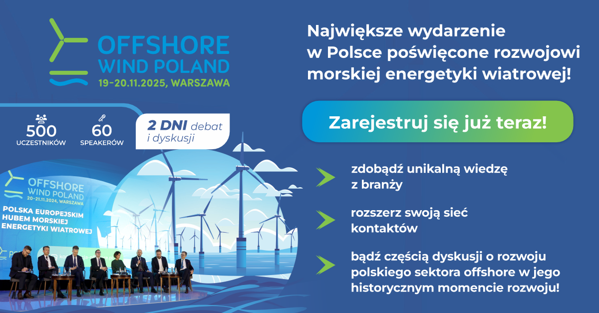 Cała branża skupiona wokół morskiej energetyki wiatrowej z Polski i Europy spotka się na Offshore Wind Poland 19-20 listopada 2025 r. w Warszawie na największej konferencji poświęconej kluczowym wyzwaniom dla sektora morskiej energetyki wiatrowej w Polsce i Europie. Więcej na www.konferencjaowp.pl