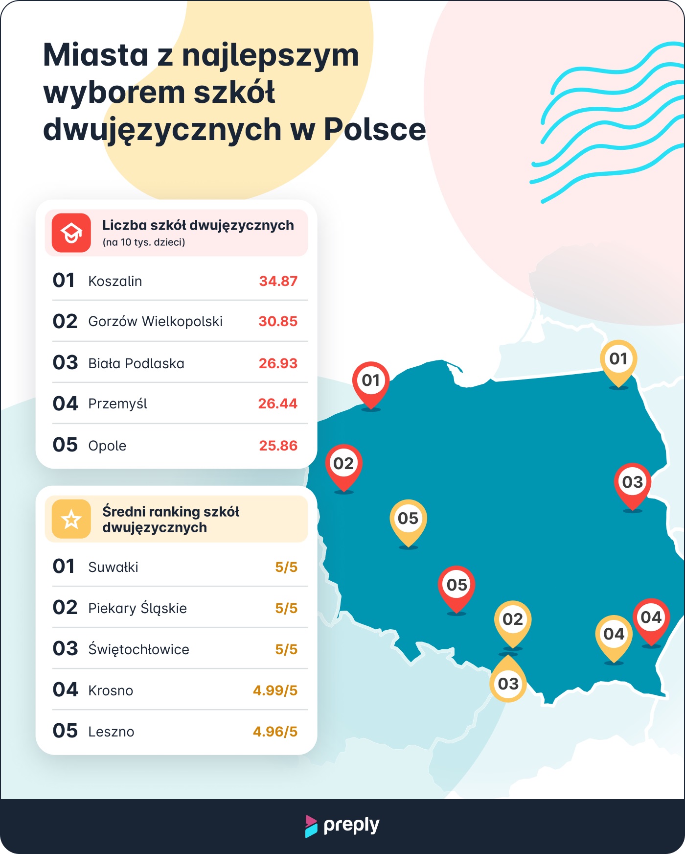 Równie ciekawy jest ranking pięciu najlepszych szkół dwujęzycznych w całym kraju. Mimo że Koszalin ma ich najwięcej, to placówki z najwyższymi ocenami znajdują się w Suwałkach, Piekarach Śląskich i Świętochłowicach. To aż dwa miasta z województwa śląskiego. Szkoły w tych miastach mogą się pochwalić średnią oceną 5 na 5.