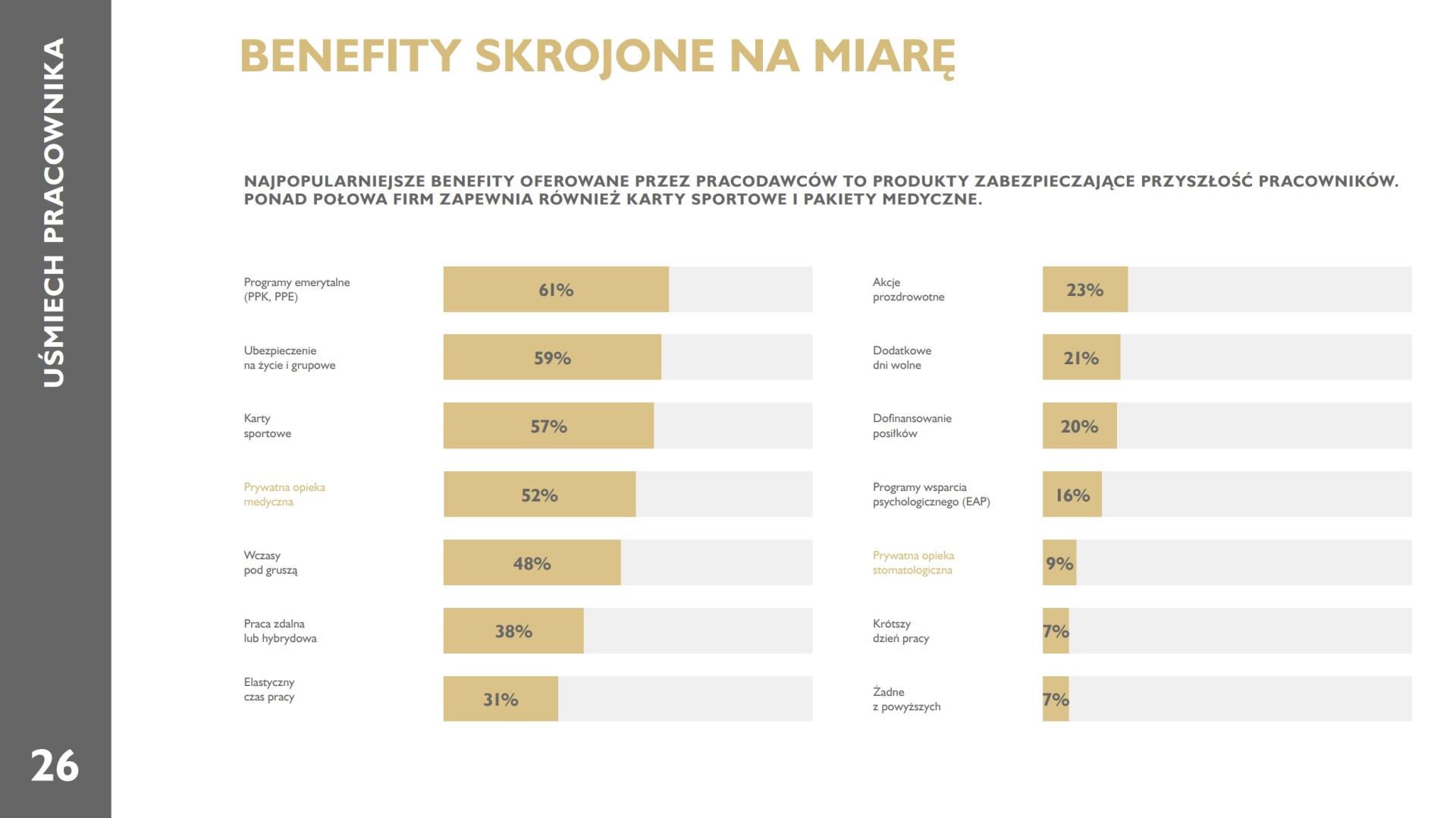 Prywatna opieka medyczna wciąż należy do najpopularniejszych i najbardziej pożądanych benefitów. Stomatologia jest jednak w ogonie: raptem 9% badanych odpowiedziało, że ma taki pakiet włączony do zestawu korzyści od pracodawcy.
